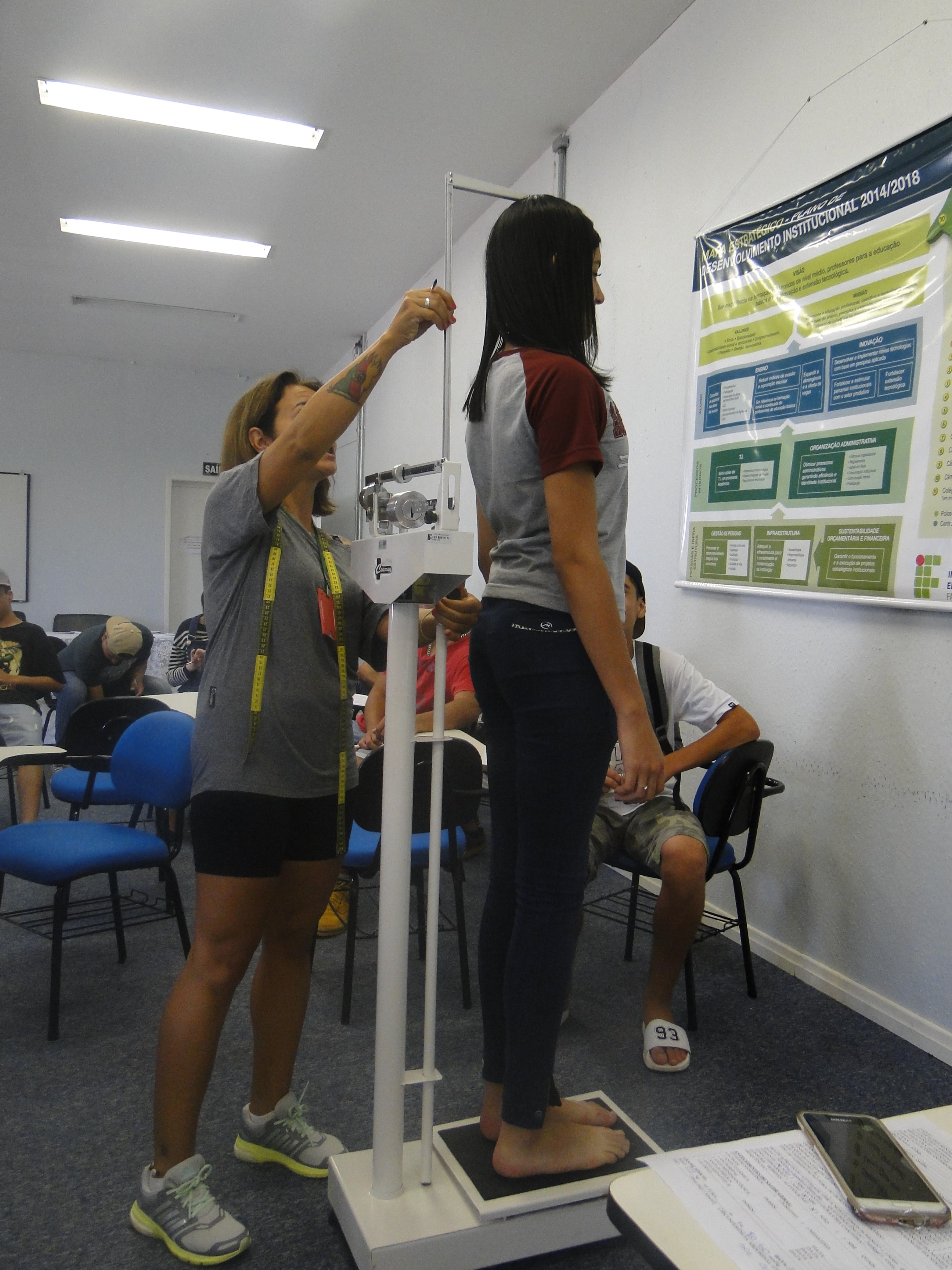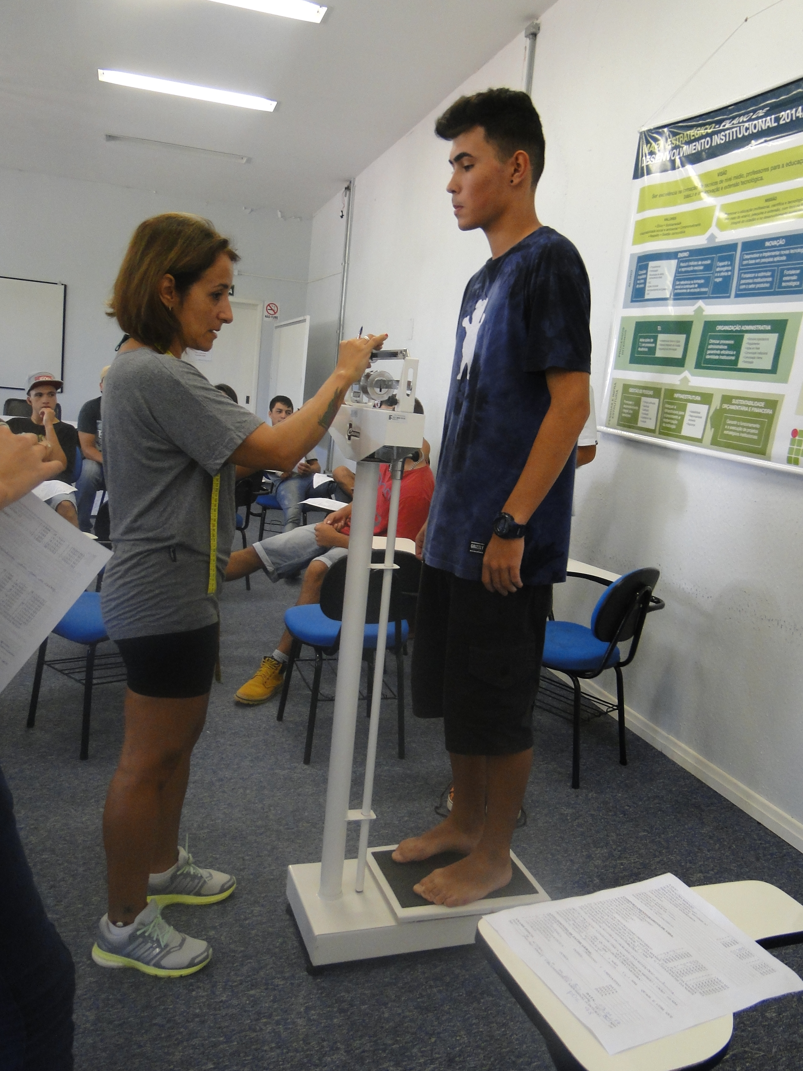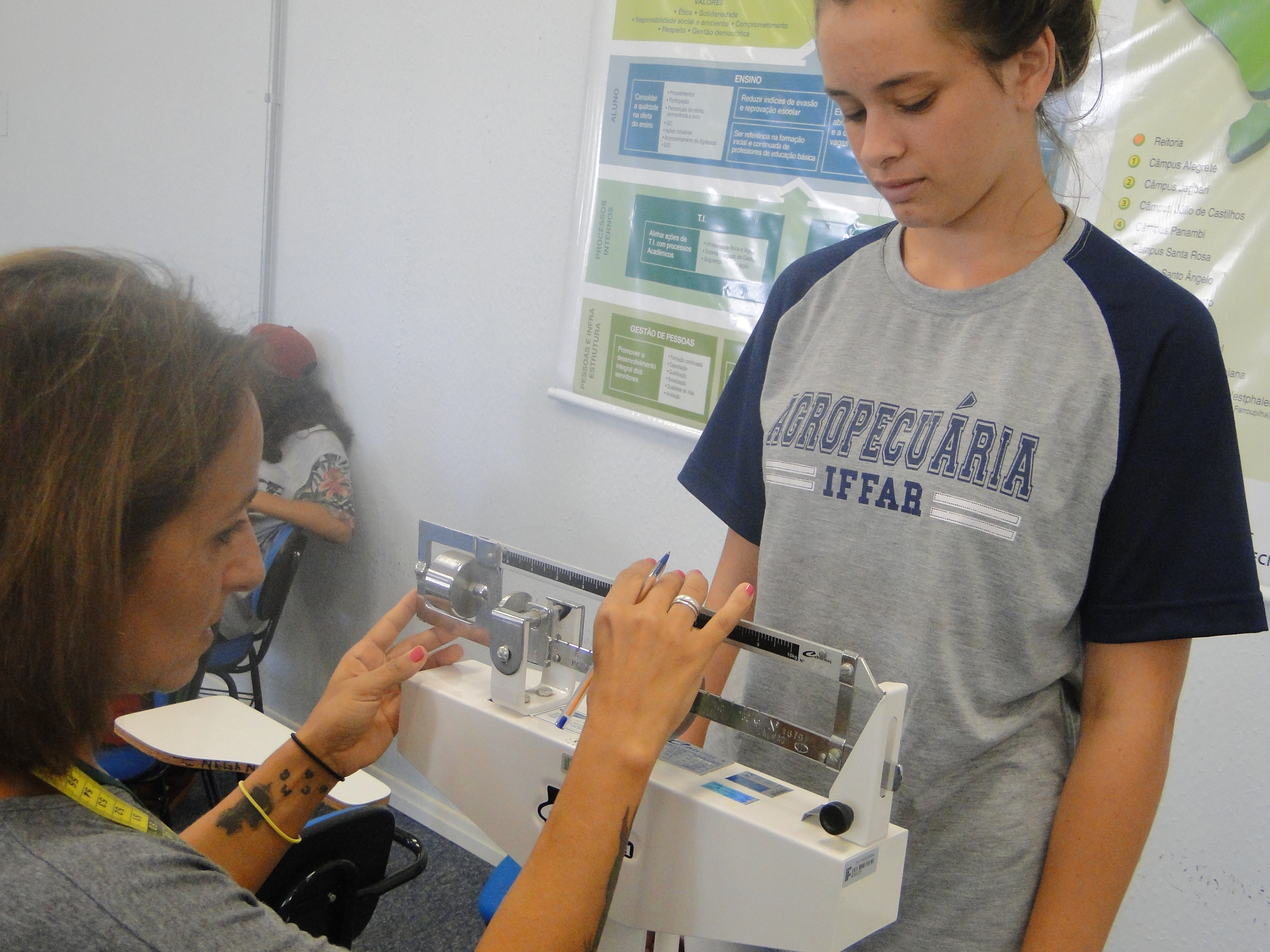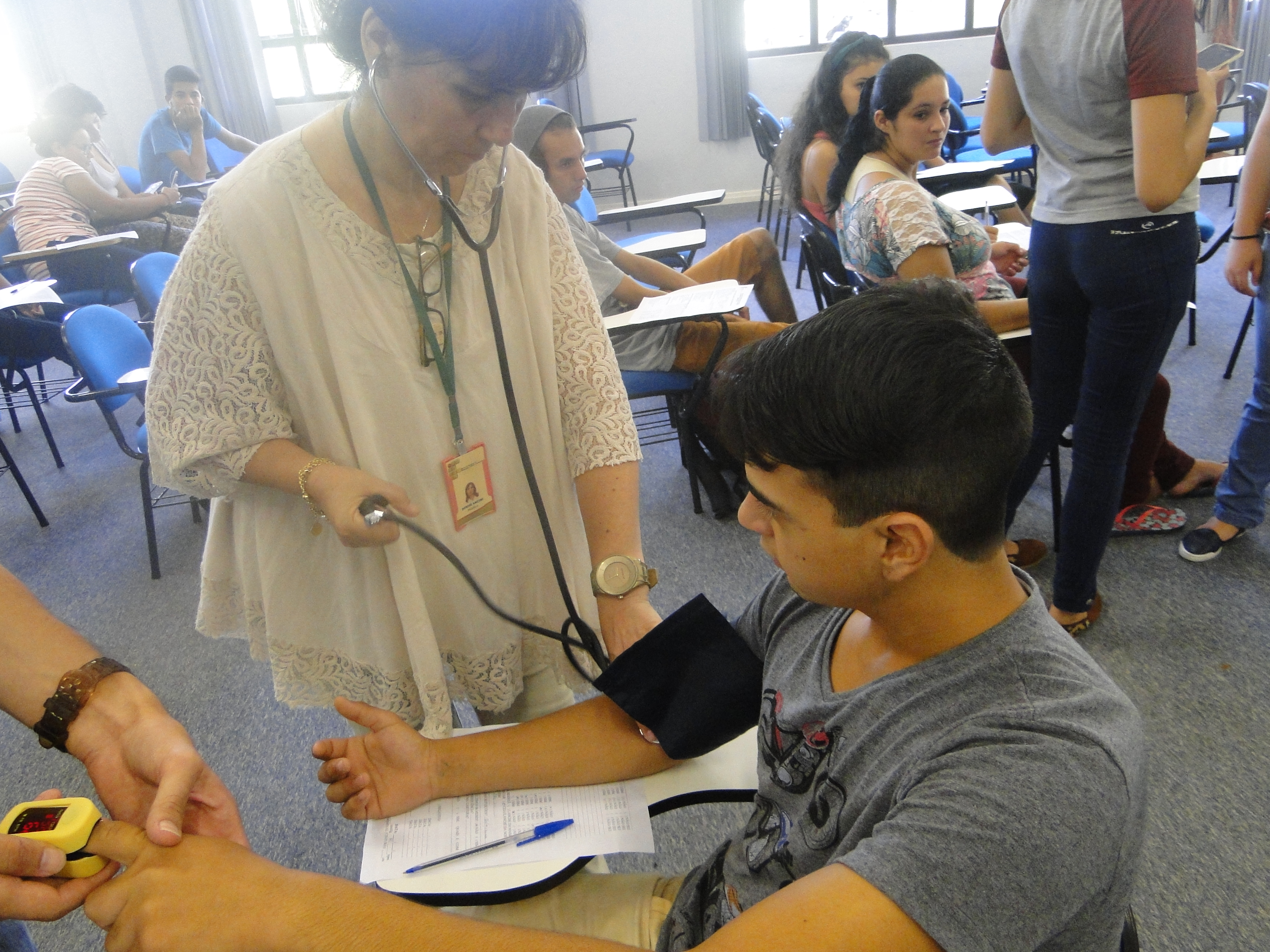 A atividade coleta dados gerais de saúde, psicosociais e odontológicos. A médica Denise Ancini, a técnica em enfermagem Gláucia Jaques e o funcionário Lucas Dornelles fizeram o levantamento de peso, altura, índice de massa corporal (imc), pressão arterial, frequência cardíaca, medidas de circunferência, entre outros, de cada estudante.