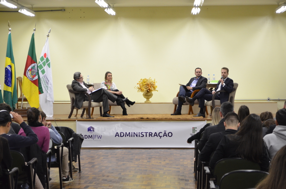 Na última quinta-feira (30) noite de encerramento da II Semana Acadêmica do Curso de Administração o Salão Social do IFFar/FW recebeu os Empresários Ramir Severiano – Diretor Geral da Vitrola e Nelci Bakoff – Presidente da Bakof Tec para o Talk Show – Desafiando o Mercado. As discussões foram moderadas pela Profª do IFSul, Marineiva Manganelli. Os empresários trouxeram reflexões sobre as mudanças do atual cenário político e econômico, e a necessidade de contínua inovação, adaptação e gestão consciente e sustentável.