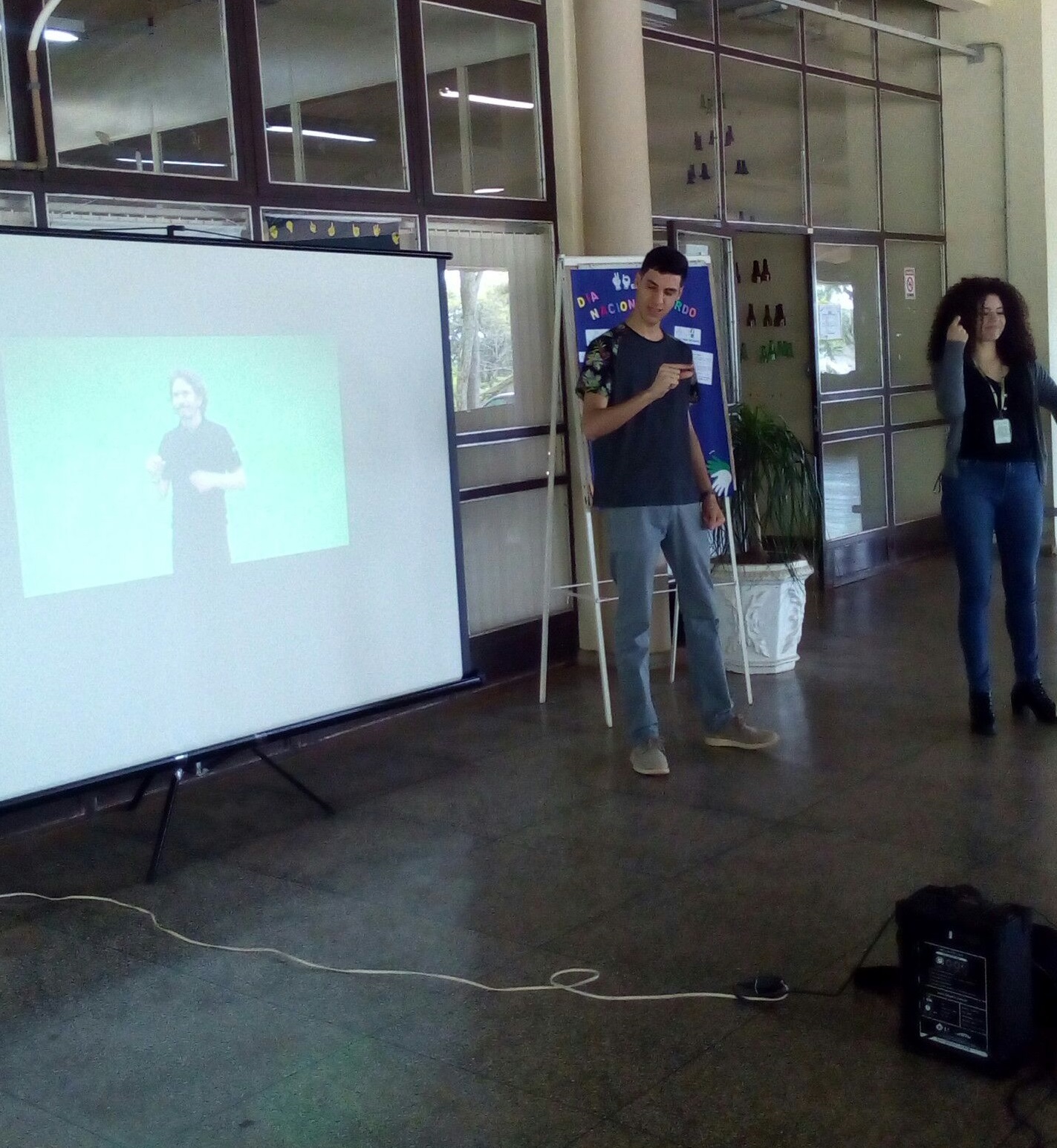 Acadêmico Lucas e Intérprete Rochiane apresentando a música Epitáfio em Libras.