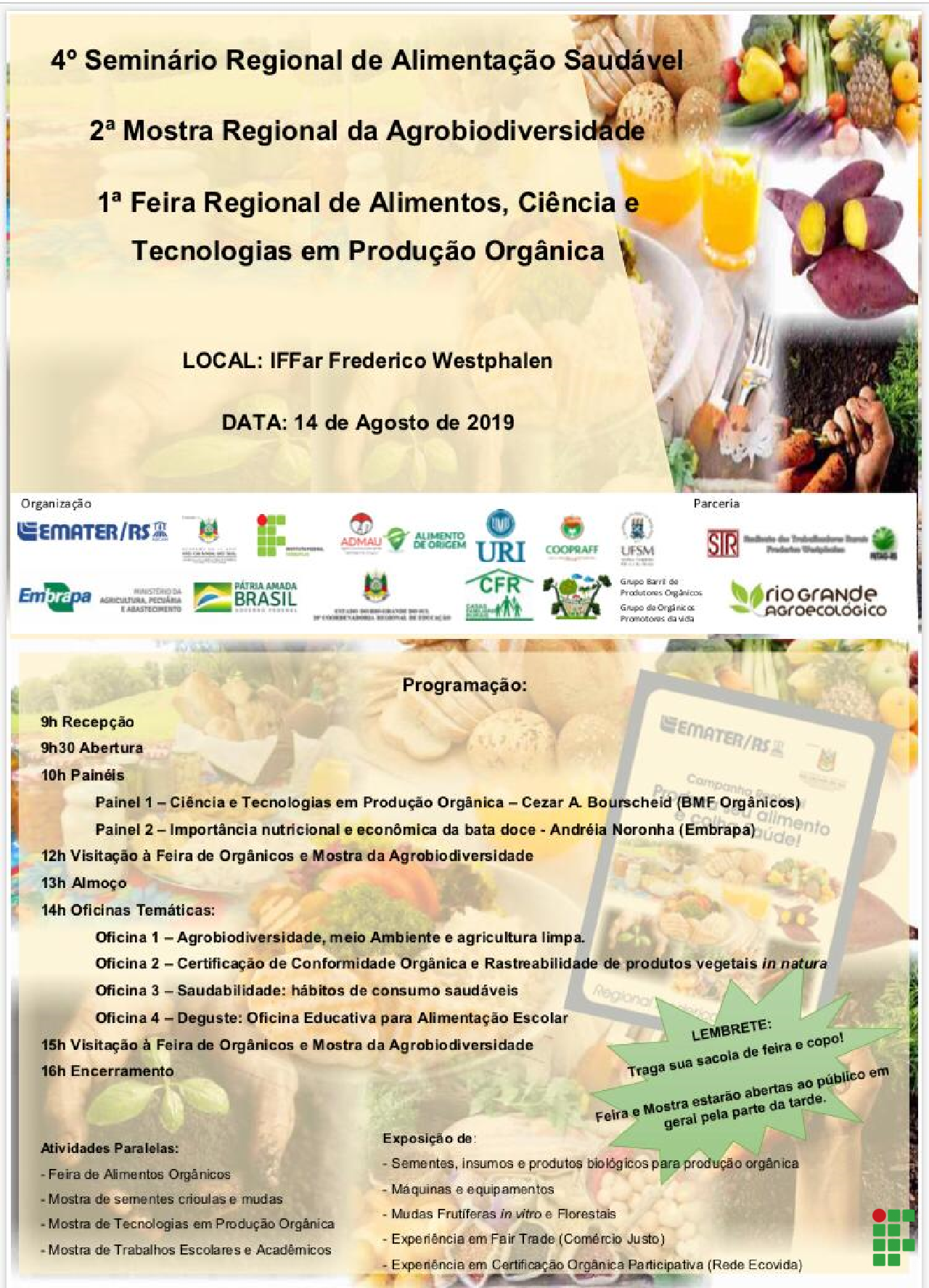 A 1ª Feira Regional de Alimentos, Ciência e Tecnologia em Produção Orgânica, juntamente com o 4° Seminário Regional de Alimentação Saudável e a 2ª Mostra Regional da Agrobiodiversidade, foram realizadas nesta quarta-feira, 14 de agosto, no IFFar Campus Frederico Westphalen.