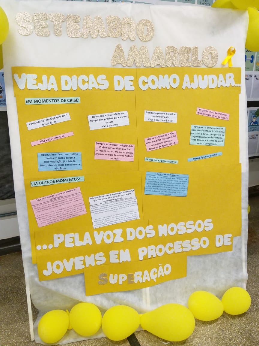 No hall de entrada do prédio principal, um painel com decorações em amarelo foi exposto. Nele, continha trechos de depoimentos escritos por estudantes em processo de superação, os quais colaboraram com orientações sobre como ajudar as pessoas. A ação teve como propósito incentivar e valorizar o cuidado da saúde mental, assim como possibilitar um maior entendimento das pessoas quanto às atitudes que podem contribuir para o bem-estar de quem estiver vivenciando momentos de ansiedade e aflição.