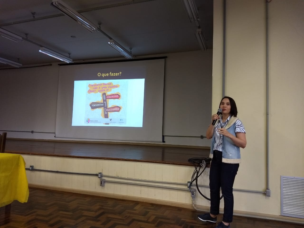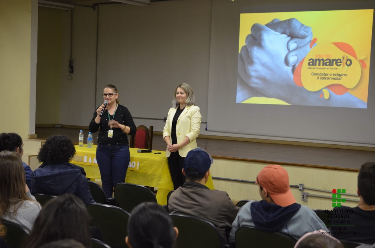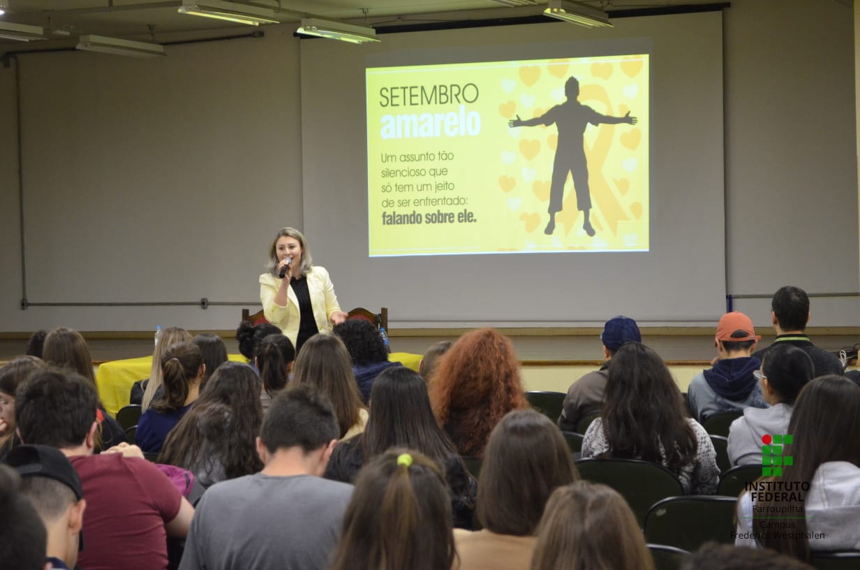 “Setembro Amarelo: Combater o Estigma é Salvar Vidas” foi a temática abordada pela Psicóloga Tatieli Peixoto Signori, em uma atividade proposta no dia 18, no Salão Social, para alunos e servidores, os quais também puderam usufruir do espaço para questionar suas dúvidas em relação ao tema. No dia 27, o setor de saúde estruturou um exercício de formação para os servidores do Campus, no enredo “Saúde mental no contexto educacional” conduzido pela médica psiquiatra Joana Leticia Carvalho Cordeiro.