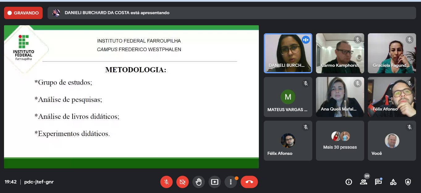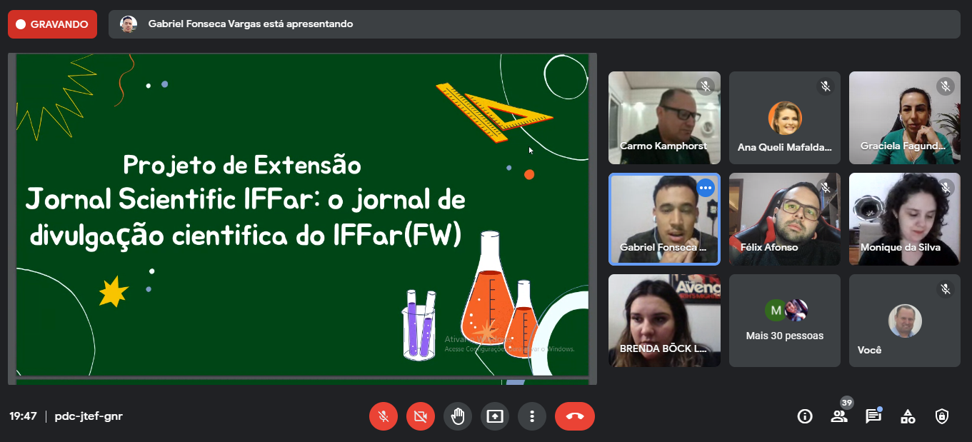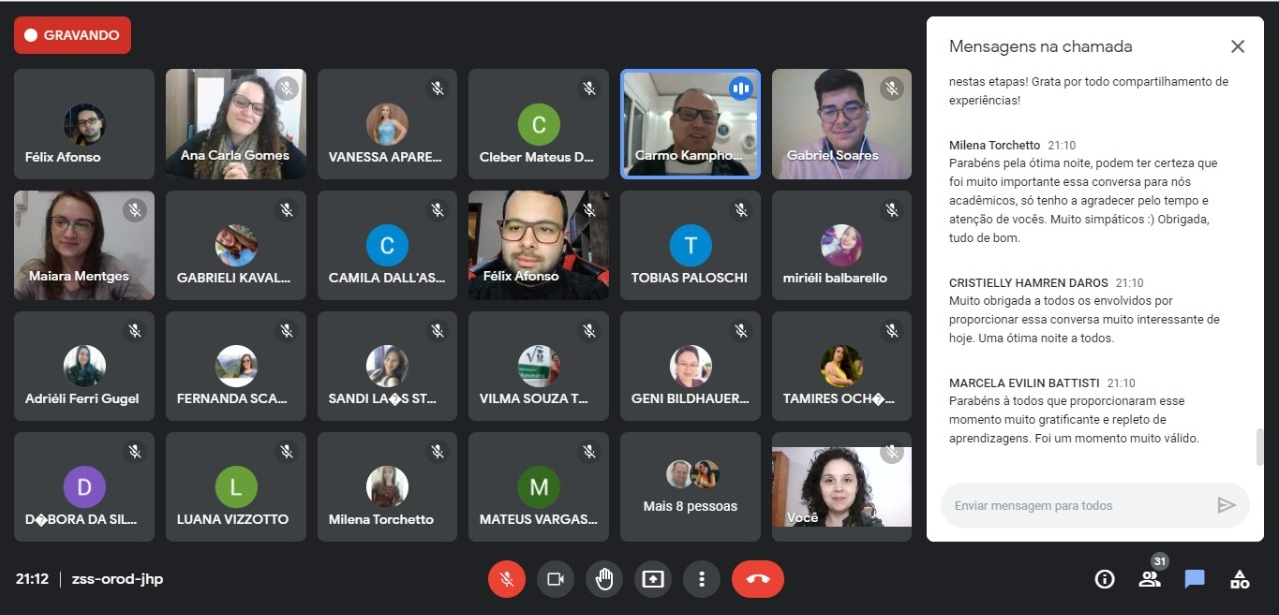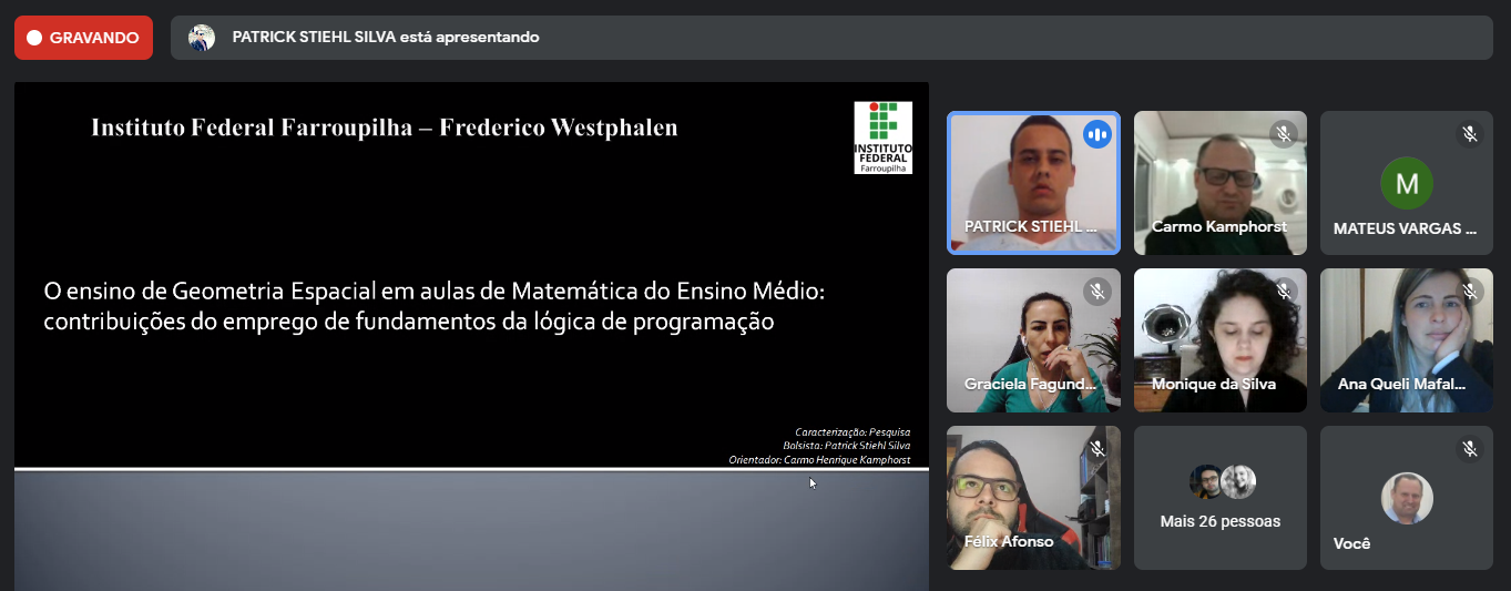 A primeira atividade ocorreu na noite do dia 26 de agosto. Nela, se propôs o compartilhamento das experiências de três convidados, sendo eles: Gabriel de Oliveira Soares, egresso do IFFar – Campus de Alegrete e doutorando em Ensino de Ciências e Matemática da UFN; Ana Carla Gomes, egressa do IFFar – Campus de Alegrete e doutoranda em Modelagem Computacional da FURG; e, Maiara Mentges, egressa do IFFar – Campus de Santa Rosa e doutoranda em Matemática Aplicada da UFRGS.