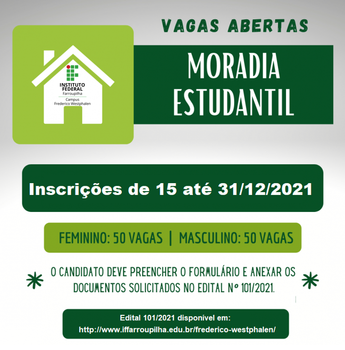 O IFFar - Campus Frederico Westphalen está com as inscrições abertas às vagas para a Moradia Estudantil – 2022/1. No total, 100 vagas estão disponíveis (50 femininas e 50 masculinas).