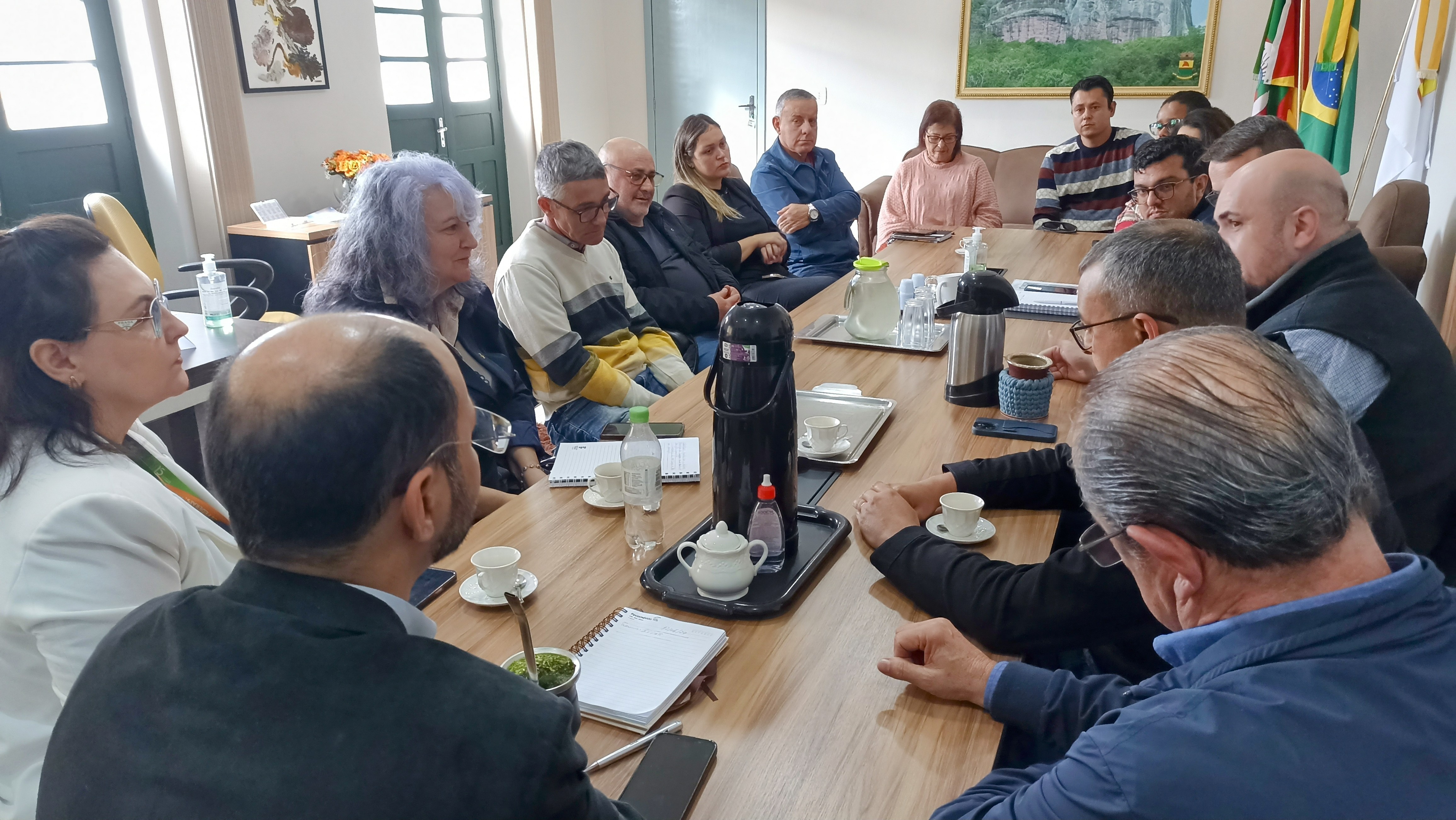 Foto: Participaram da reunião a reitora do IFFar, professora Nídia Heringer; o prefeito de Caçapava do Sul, Giovani Amestoy; o vice-prefeito de Caçapava do Sul, Luiz Carlos Guglielmin; o prefeito de Santana da Boa Vista, Garleno Alves da Silva; o vereador de Caçapava do Sul, Boca; o vereador de Santana da Boa Vista, Cristian dos Santos; a secretária de Educação de Caçapava do Sul, Gislaine Huerta; a secretária de Planejamento e Meio Ambiente de Caçapava do Sul, Cássia Freitas; o procurador de Caçapava do Sul, Benhur Machado; o coordenador pedagógico de educação, professor Edimar Fonseca; o professor da rede estadual de ensino, Norton Ferreira; o presidente da Associação Comercial e Industrial de Caçapava do Sul, Eraldo Souza; a chefe do gabinete da reitora do IFFar, Dalva Pillar; o pró-reitor de Desenvolvimento Institucional do IFFar, Carlos Lehn; o diretor de Planejamento e Desenvolvimento Institucional, Gabriel Garcia; e os servidores(as) do IFFar Kauana Amaral, Anelise Cruz e Alberto Galli/ARP.