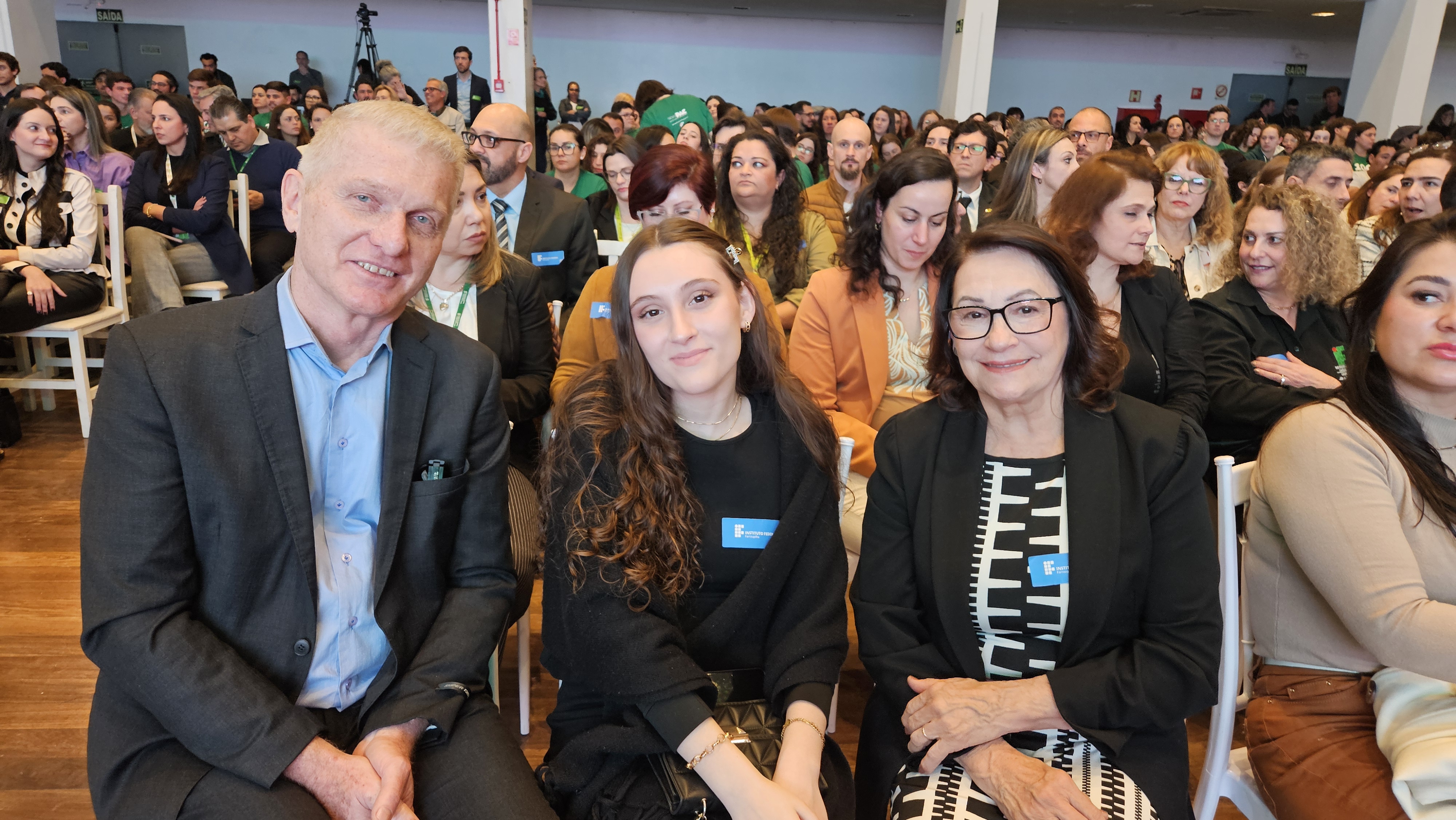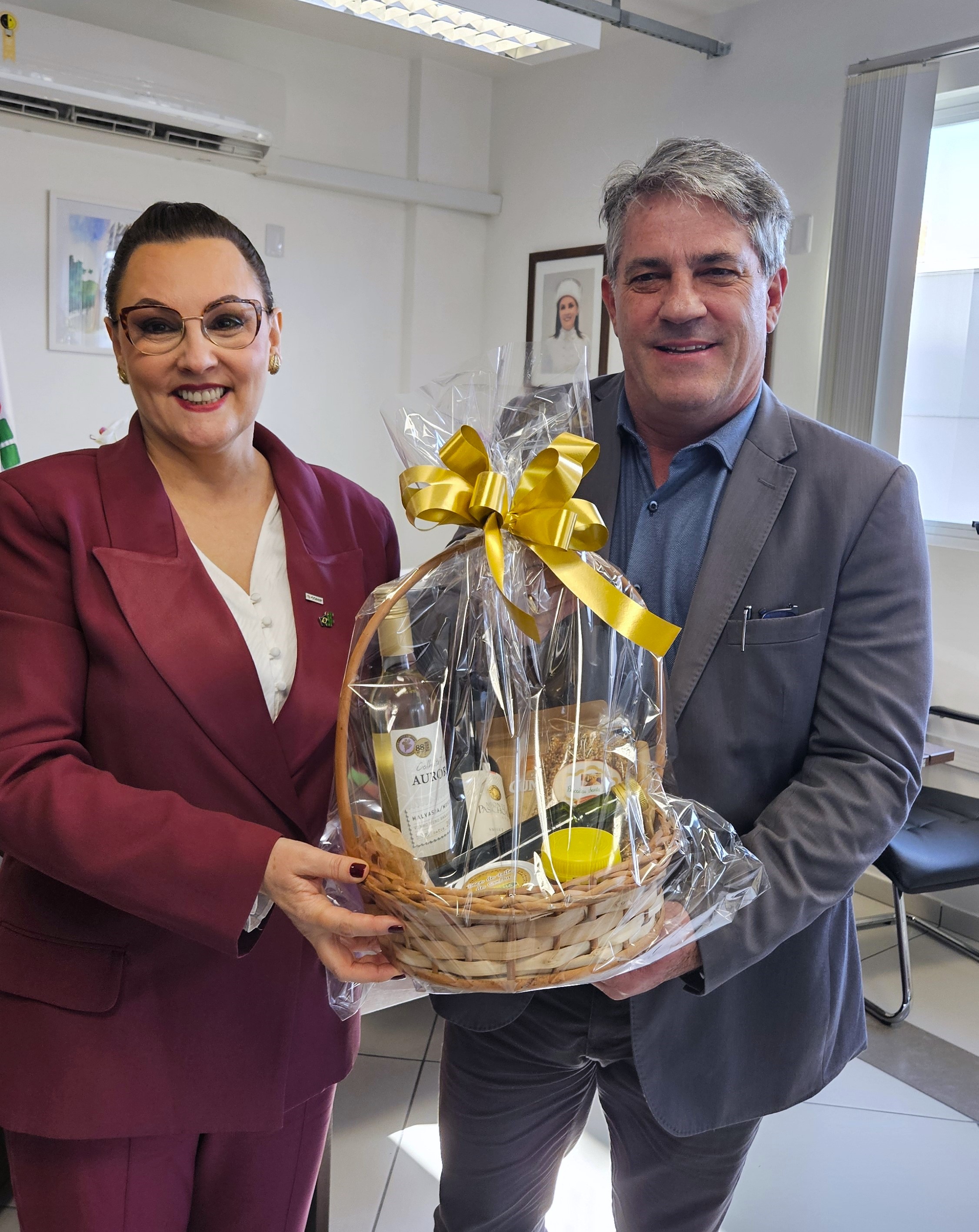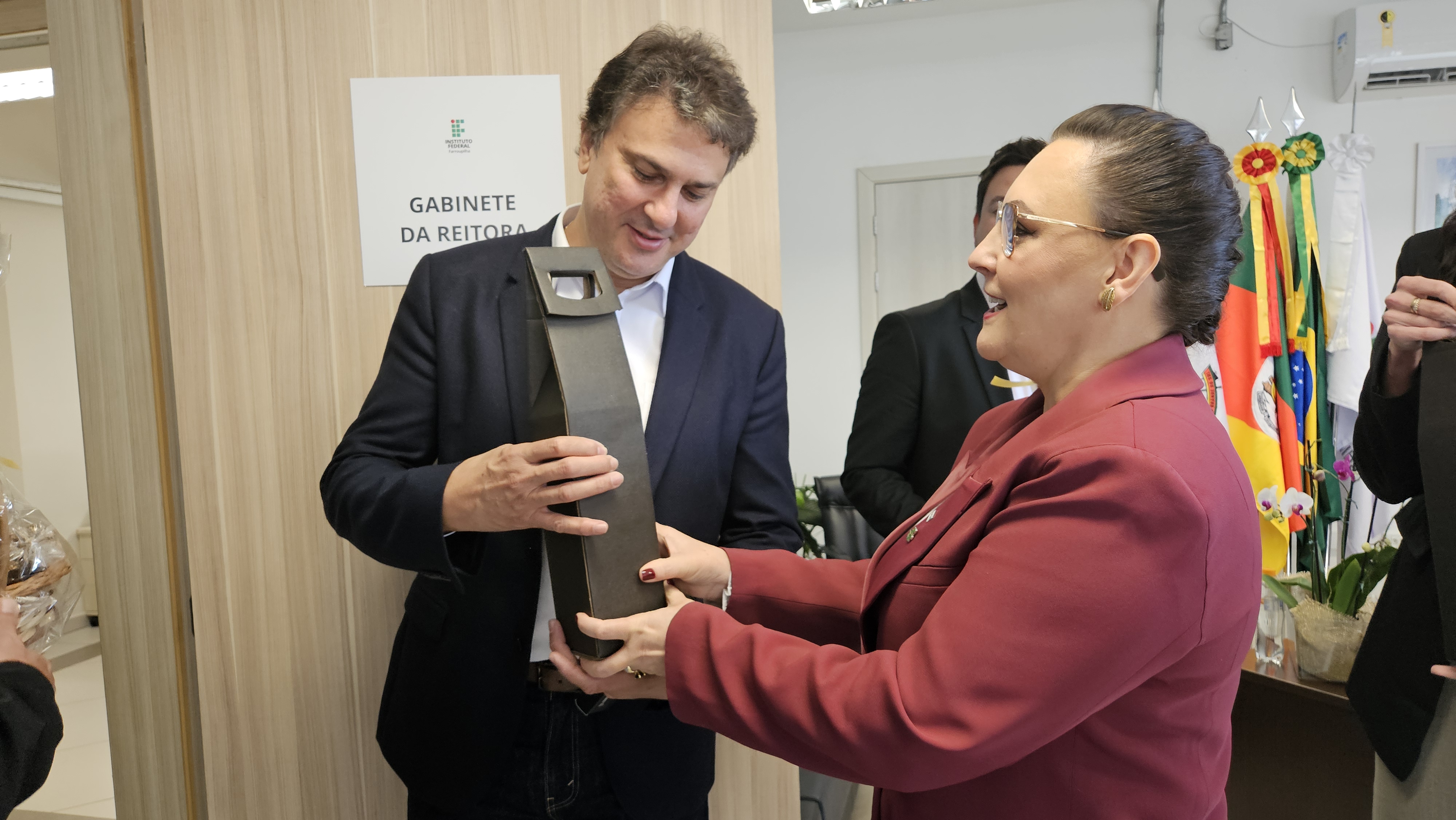 Nesta quinta-feira (21), a reitora do IFFar, professora Nídia Heringer, recebeu em seu gabinete o ministro da Educação, Camilo Santana. O ministro esteve em Santa Maria para a cerimônia que marcou a recondução da reitora ao cargo para a gestão 2025-2029. O evento, realizado no Salão Nobre do Avenida Tênis Clube, reuniu autoridades, servidores e cerca de 400 estudantes de todos os campi do IFFar.