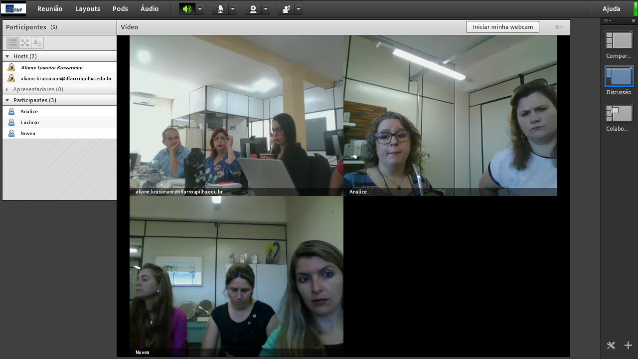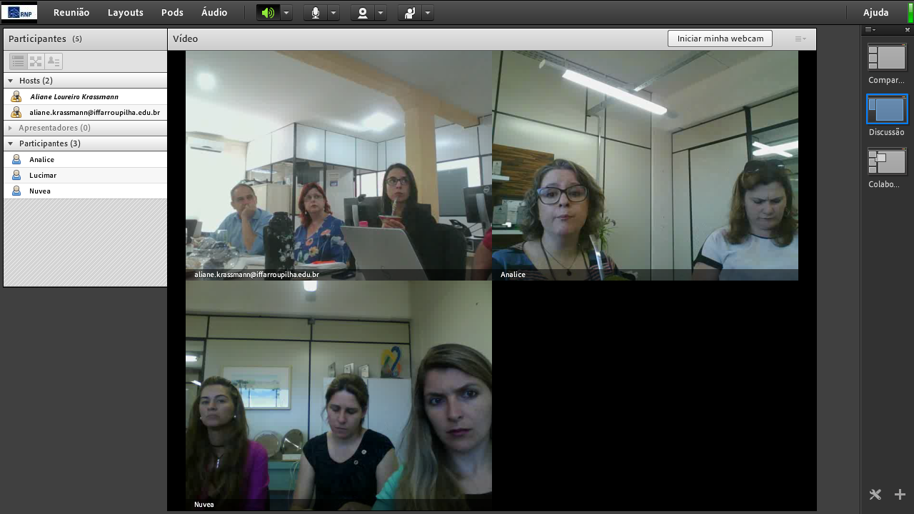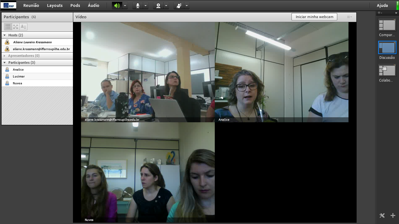 Destaca-se ainda que esta modalidade de reunião trás diversas vatangens principalmente a flexibilidade, agilidade e economia dos cofres públicos, uma vez que não há necessidade de gastos com diárias e/ou passagens. Ao final da reunião definiu-se pela construção do PPC (Projeto Pedagógico do Curso) que terá reformulação durante o ano de 2017. A previsão do início do curso é para o segundo semestre de 2018.