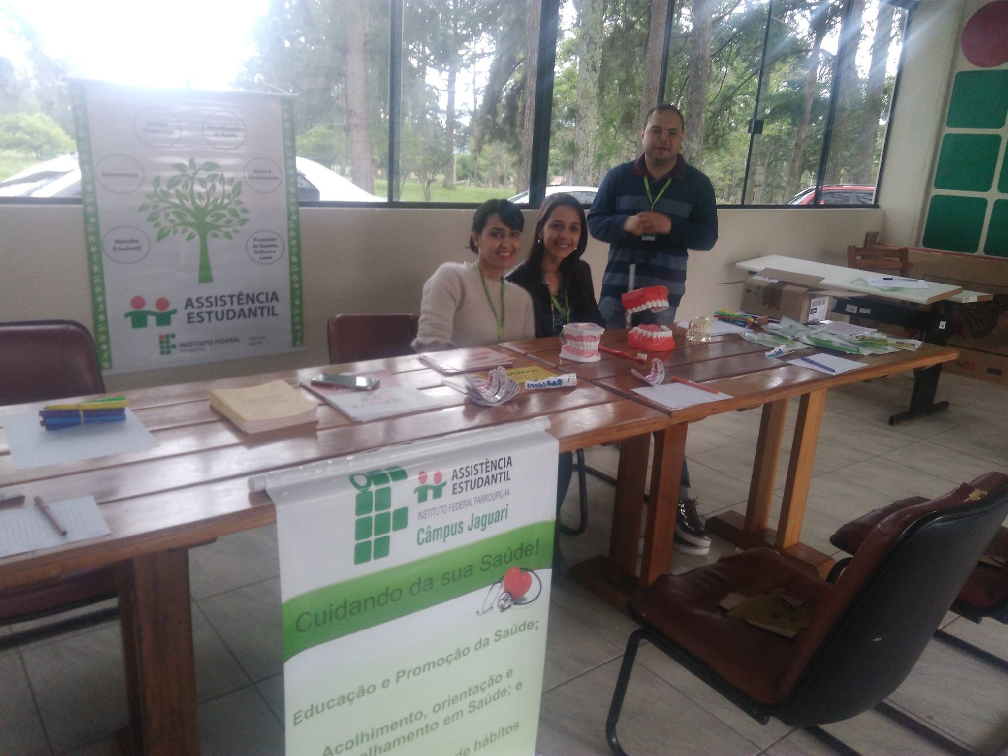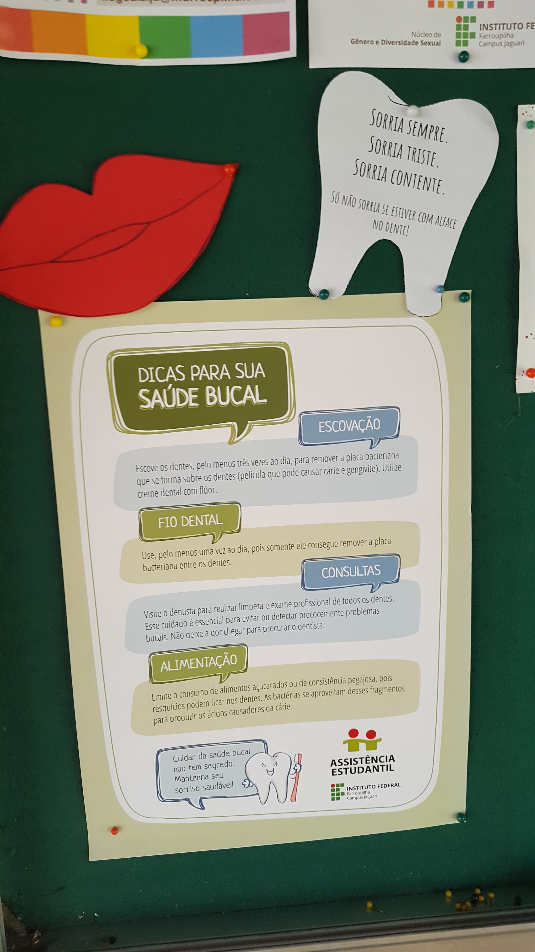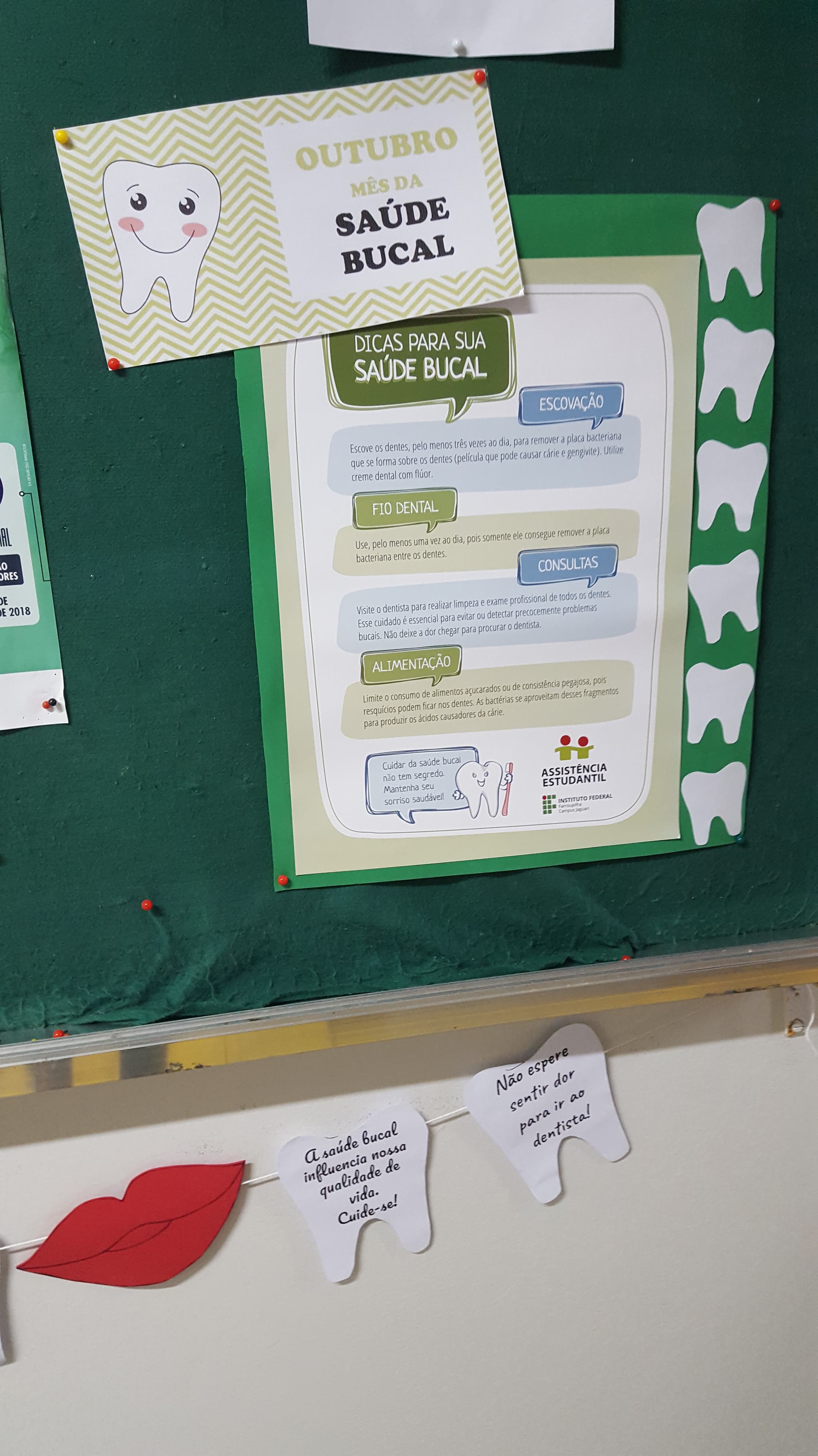 Durante o mês de outubro foram feitas ações no campus Jaguari para comemorar a importância da saúde bucal na qualidade de vida, visto que neste mês comemora-se o Dia Nacional da Saúde Bucal e o Dia do Dentista. O campus foi decorado com lembretes sobre saúde bucal, além de conversas sobre o tema inseridas em atividades para alunos e servidores.