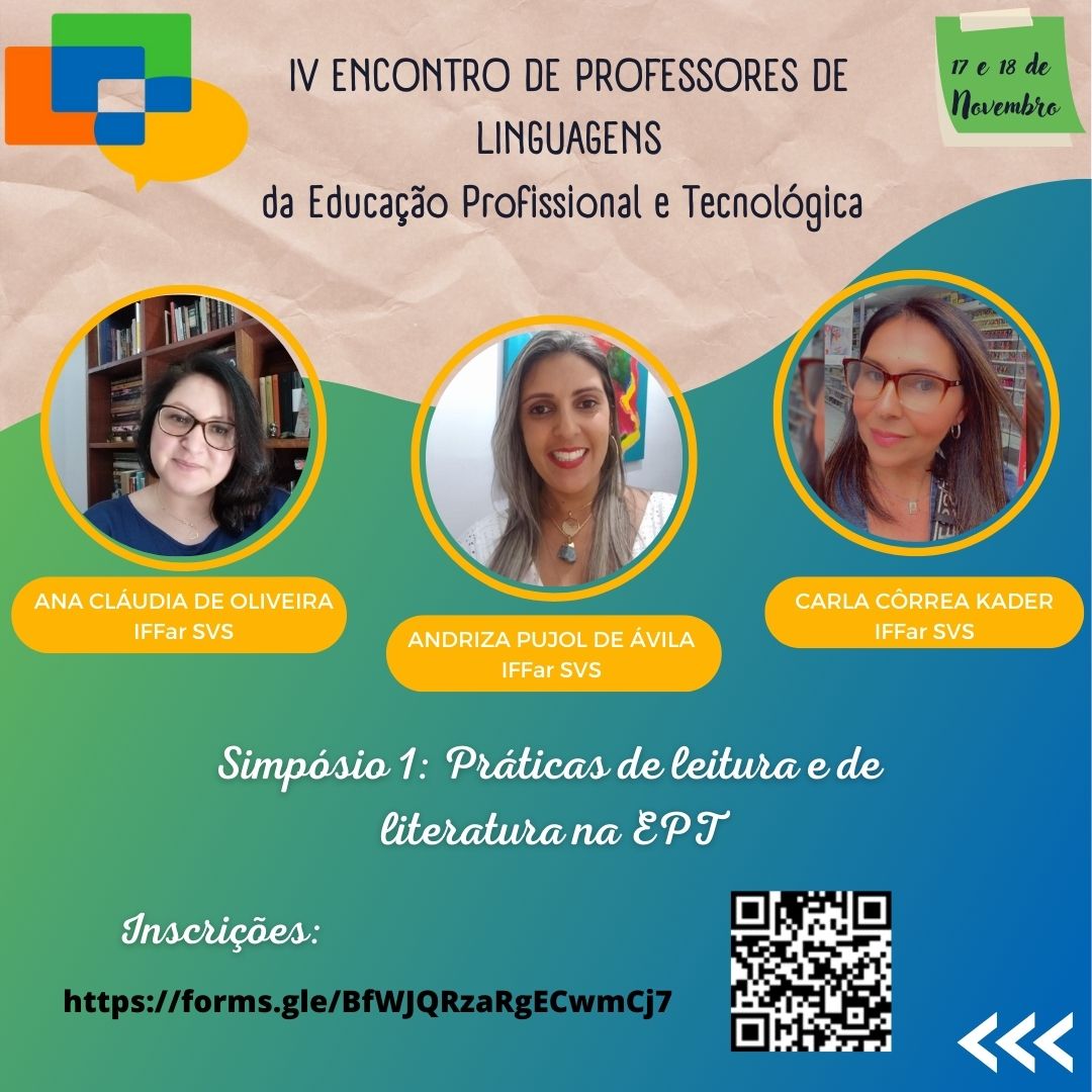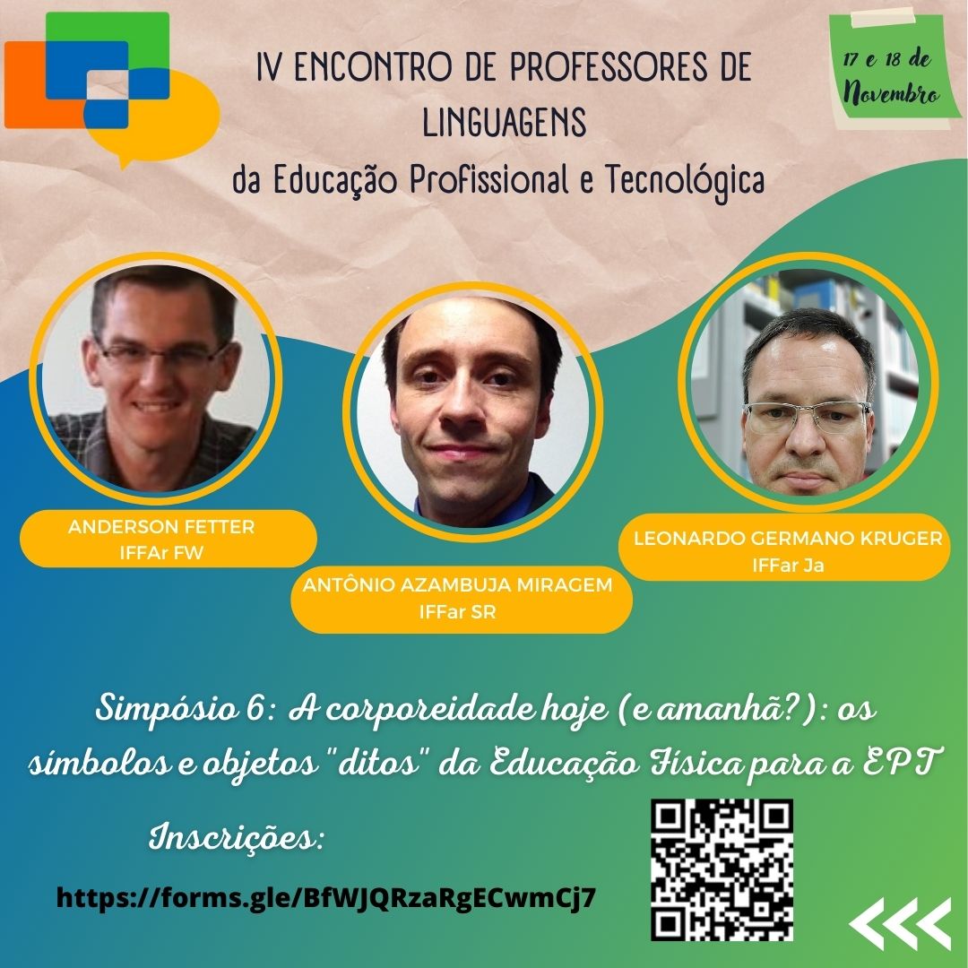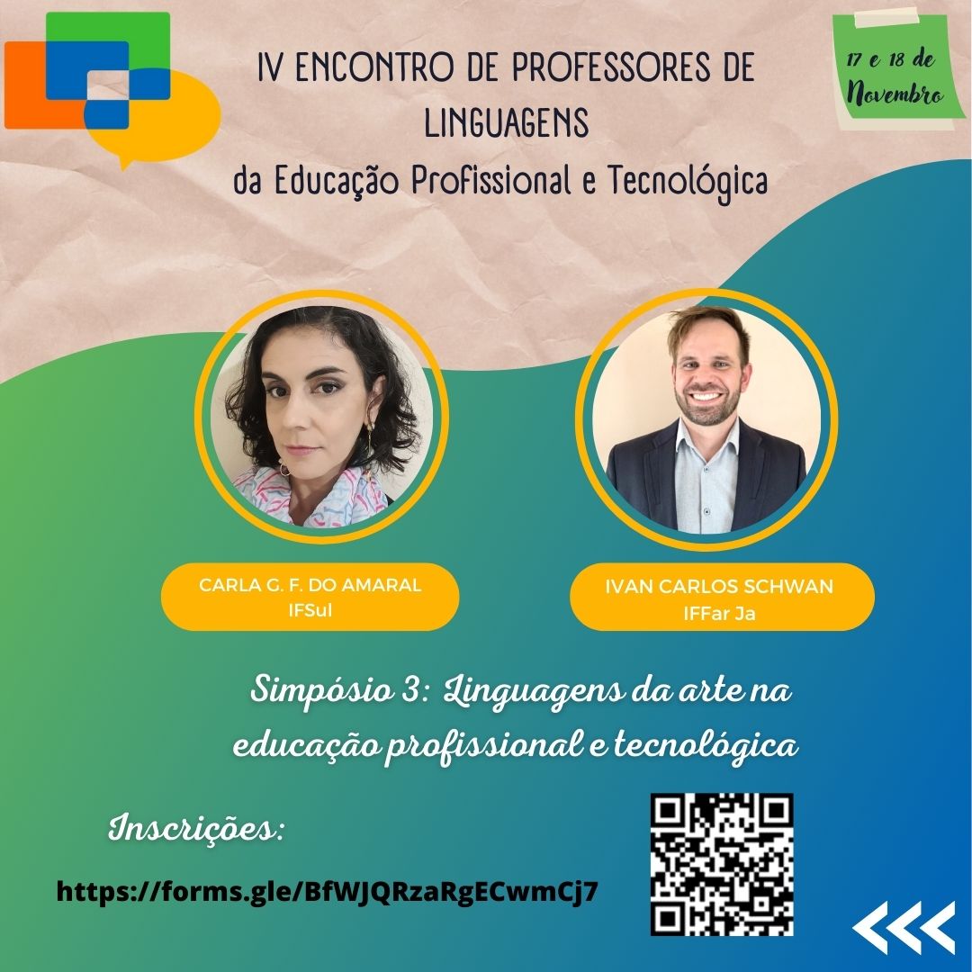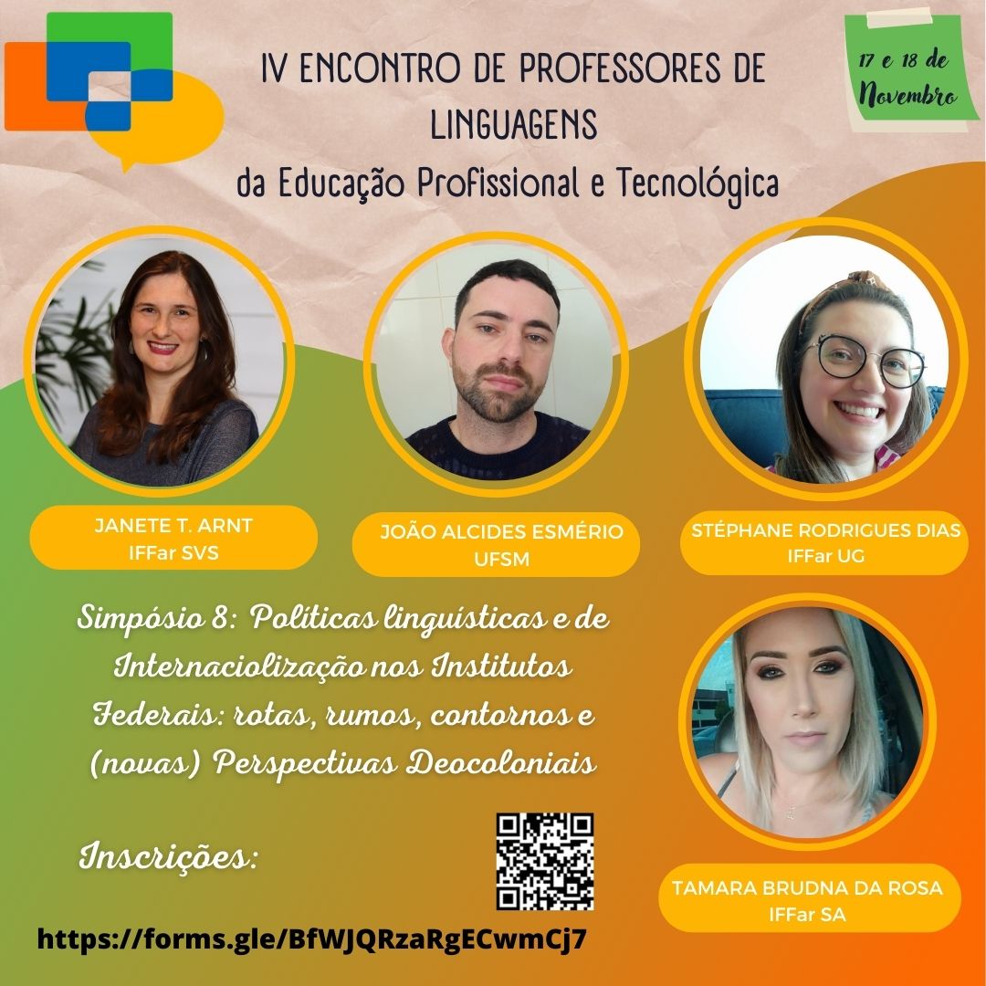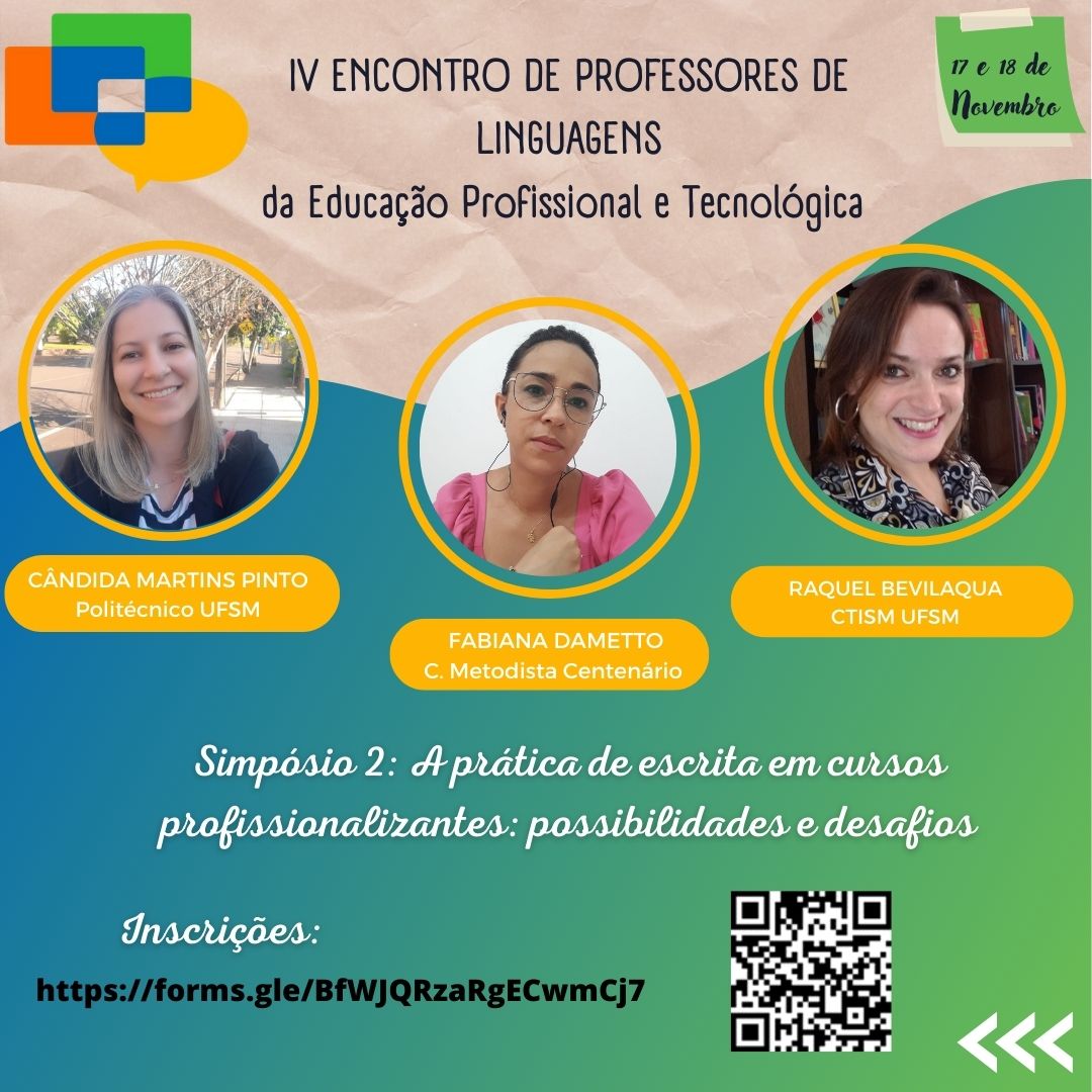 Os professores de Linguagens do Instituto Federal de Educação, Ciência e Tecnologia Farroupilha, do Colégio Politécnico da UFSM, do Colégio Técnico Industrial de Santa Maria, do Instituto Federal de Educação, Ciência e Tecnologia Sul-iograndense e do Instituto Federal de Educação, Ciência e Tecnologia do Rio Grande do Sul convidam os professores de linguagens e/ou interessados a participar do IV Encontro de Professores de Linguagens da Educação Profissional e Tecnológica (EPT), a ser realizado nos dias 17 e 18 de novembro de 2022, na modalidade on-line e totalmente gratuito.