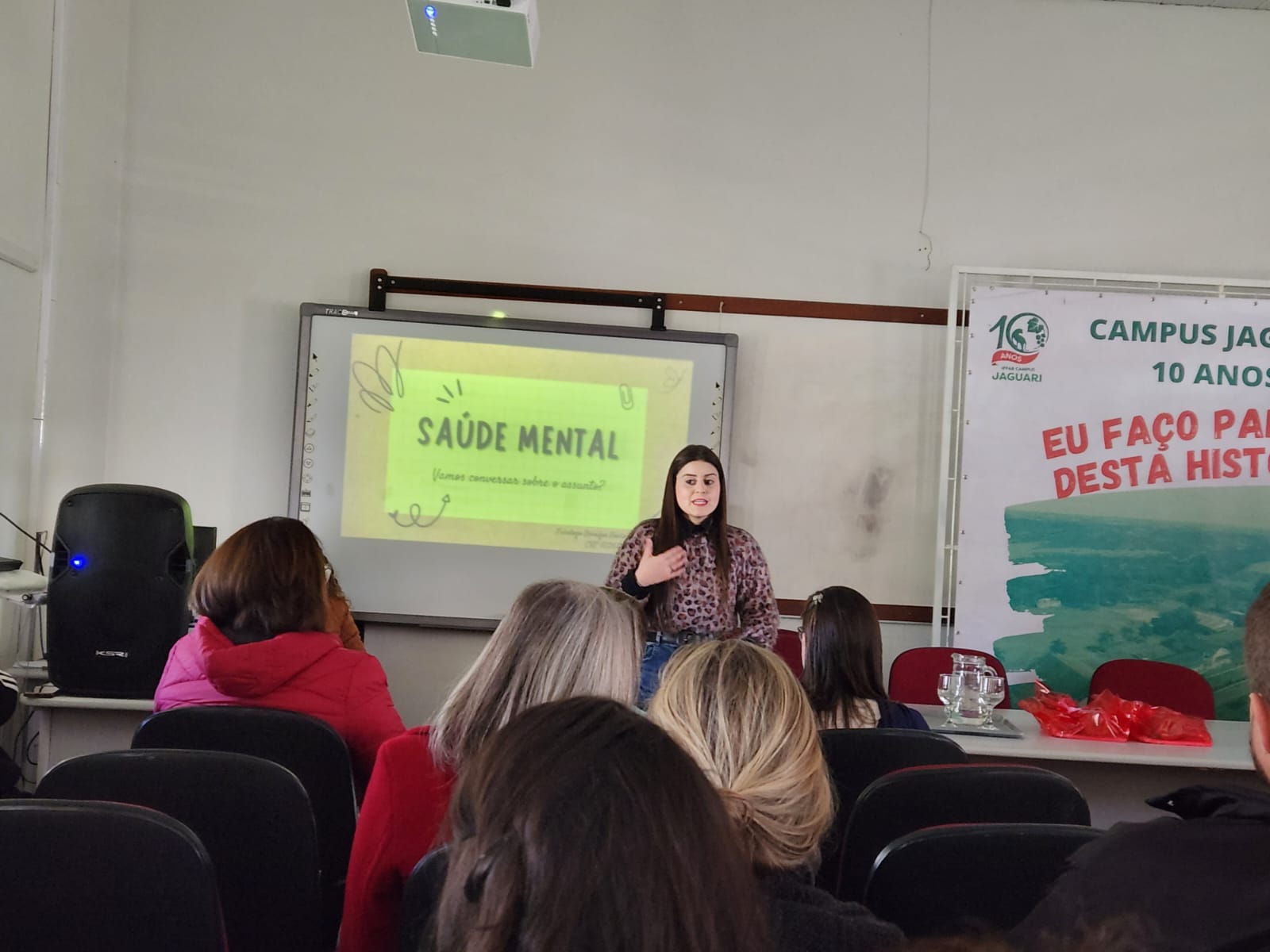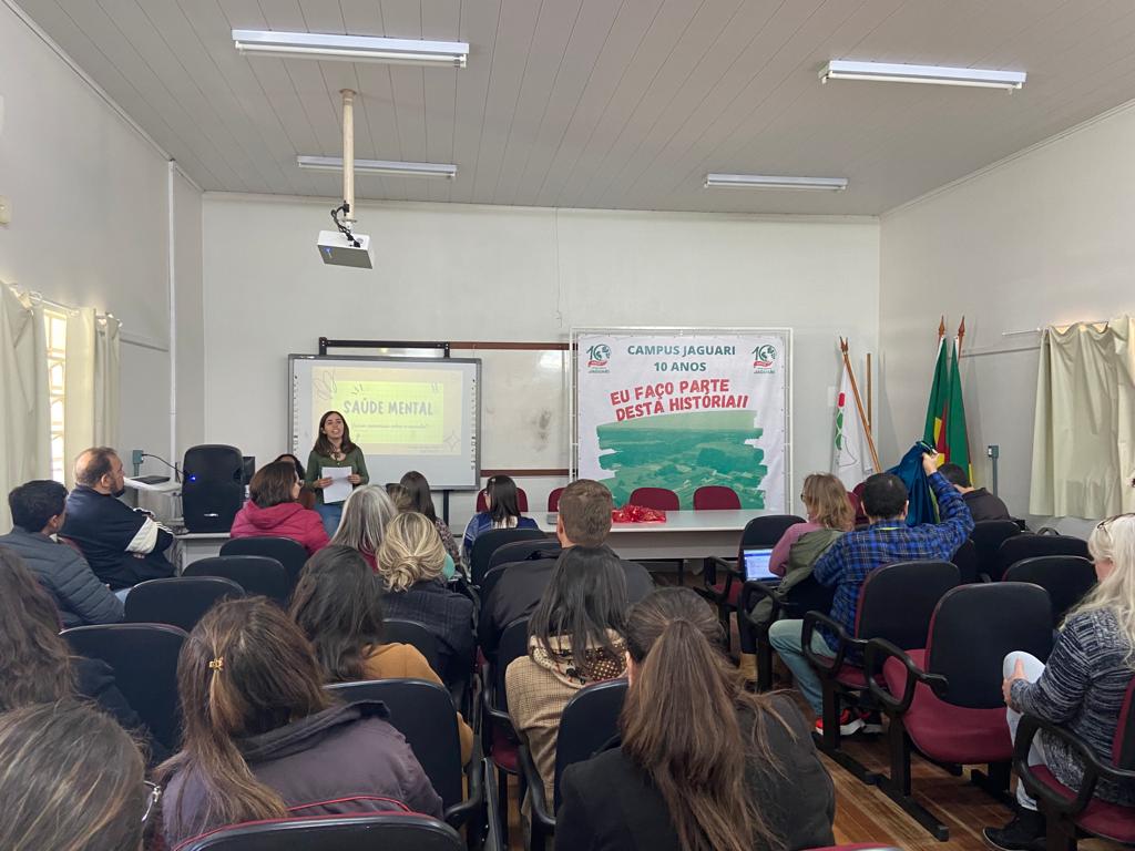 No dia 6 de setembro de 2023, ocorreu, durante reunião geral para os servidores do IFFar Campus Jaguari, a roda de conversa com a temática Setembro Amarelo: Saúde Mental e relações sociais. A atividade foi organizada pelas estagiárias de psicologia Ketlhem Minussi da Silveira e Julyanne Maciel Maia Gonzales da Costa, juntamente com a equipe da Assistência Estudantil (CAE/JA), por meio do Projeto Institucional de Desenvolvimento Viver Melhor: Promoção da Saúde do Servidor. O momento foi conduzido pelas palestrantes Dienifer Cibele Amaral Pavão (Psicóloga clínica e servidora pública do municipal em Jaguari/RS), e Valúrzia Aguirre Nascimento (Técnica de enfermagem na Prefeitura Municipal de Jaguari/RS), que abordaram e desenvolveram ações de prevenção e promoção da saúde mental, bem como estratégias de comunicação para o aprimoramento das relações interpessoais. Nessa oportunidade, agradecemos as palestrantes, e a Secretaria Municipal de Saúde do município de Jaguari