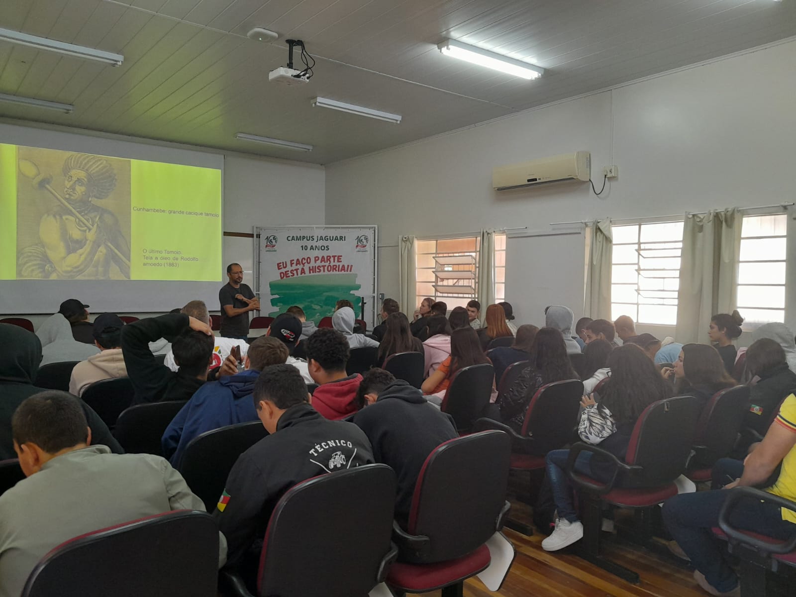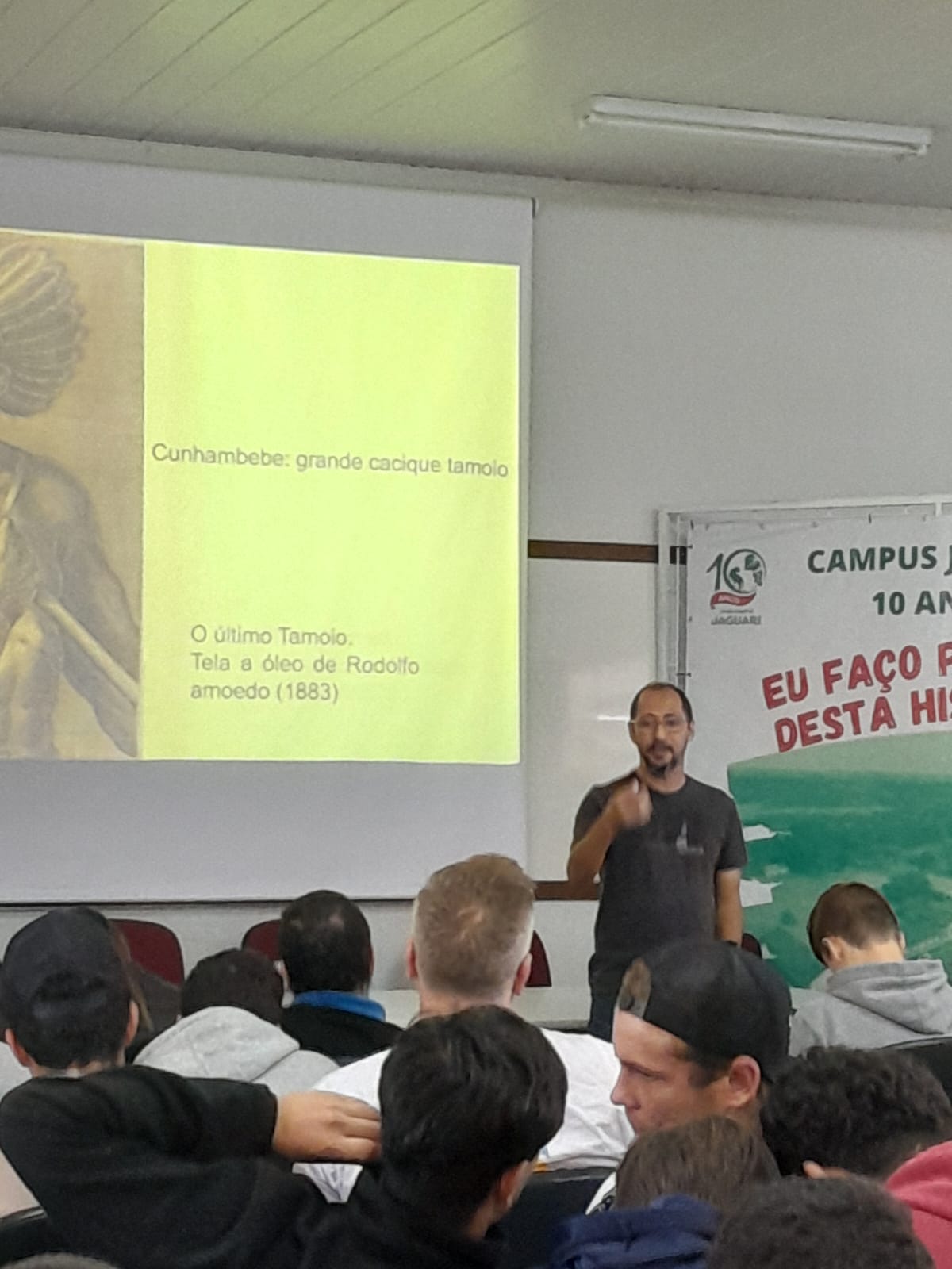 Na quarta-feira, 17 de abril, a Coordenação de Ações Afirmativas - CAA e o Núcleo de Estudos Afro-Brasileiros e Indígenas - NEABI do IFFar - Campus Jaguari realizaram uma atividade alusiva ao Dia dos Povos Indígenas (19 de abril). Na ocasião, estudantes das turmas de 1º’s e 2º’s anos dos Cursos Técnicos Integrados em Agricultura e Sistemas de Energia Renovável participaram de uma conversa com o professor Max Roberto Pereira Ribeiro com a temática "Povos Indígenas do Brasil". Max Ribeiro é doutor e pesquisador na área de História Indígena, e, atualmente é professor substituto do IFFar - Campus Alegrete.