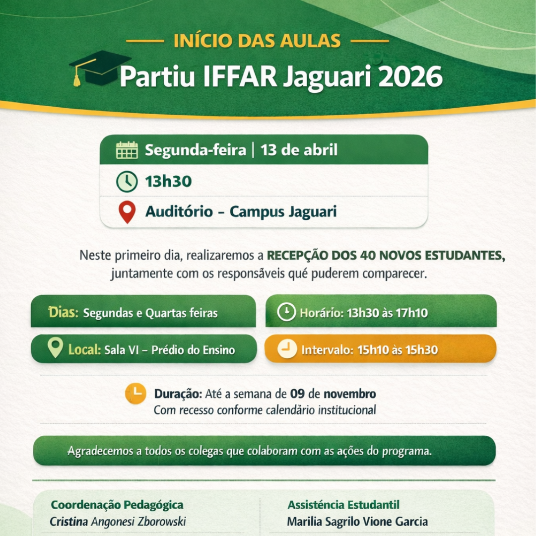 Desta forma, reforçamos o convite a todos os colegas do Campus a participarem deste momento de recepção e acolhimento dos novos alunos do Partiu IF JA 2026, na segunda-feira (13/04) às 13 h 30.