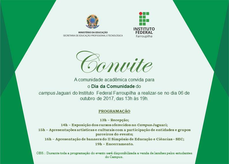 Nesta sexta-feira (6), a partir das 13 horas, o IFFar - Campus Jaguari, realiza o Dia da Comunidade. Neste dia, o Campus será aberto à comunidade externa para que todos possam conhecer a instituição.