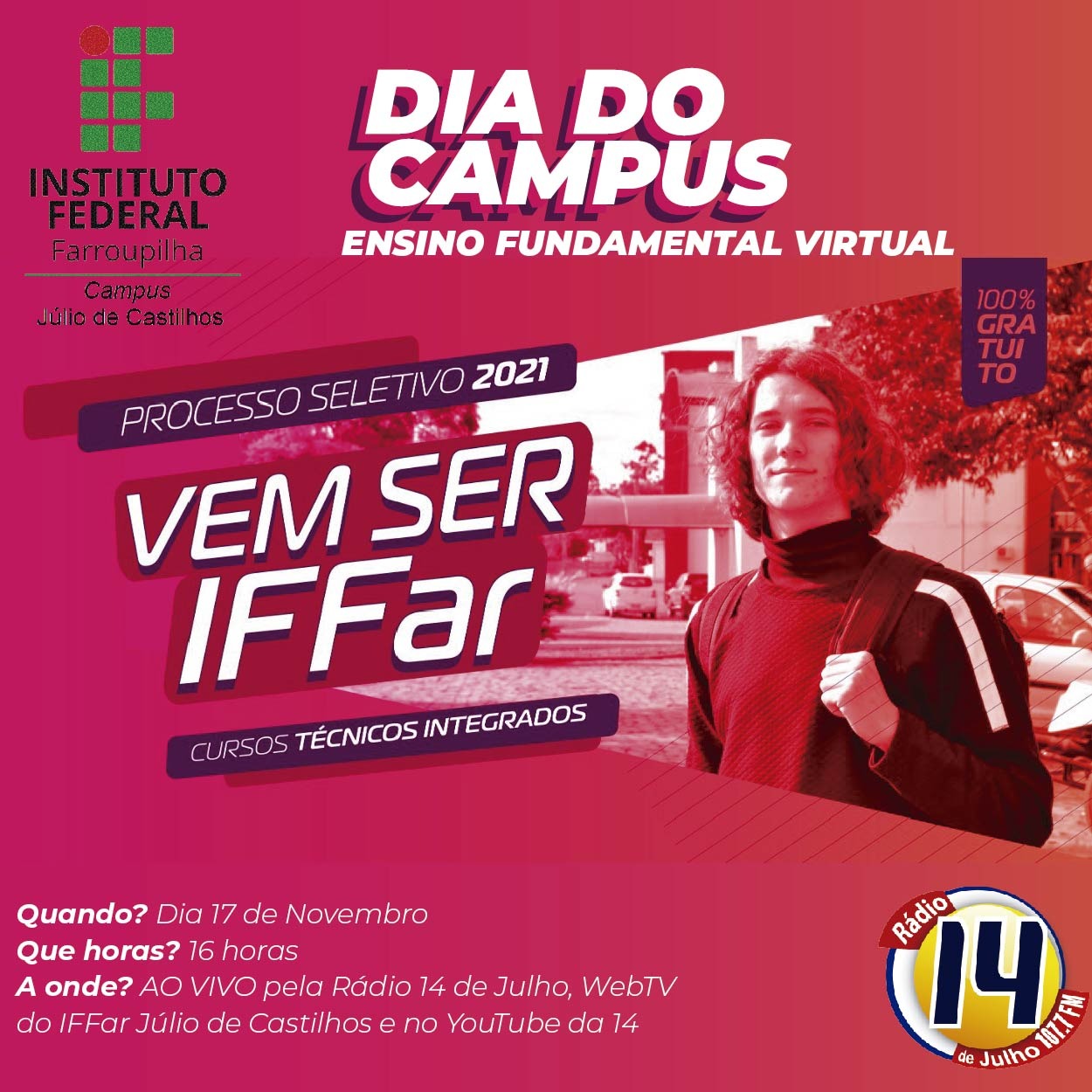 O Dia de Campus acontece anualmente, desde 2016 e recebe a visita de estudantes do município e região e tem como objetivo divulgar o processo seletivo. Nesse ano, devido a pandemia de covid-19, os organizadores precisaram se adaptar. A diretora Daniela Schittler destaca que "nossa rotina mudou, a rotina das escolas mudaram. E neste cenário de incertezas e mudanças, tivemos que repensar muitas práticas no nosso dia a dia e, inclusive a forma de seleção (tínhamos uma prova aplicada presencialmente – com a participação de aproximadamente 500 candidatos e seus familiares que aproveitavam o momento para conhecer o campus. E como realizar a divulgação?. Assim, surgiu a ideia de uma live em parceria com a Radio 14 de Julho."