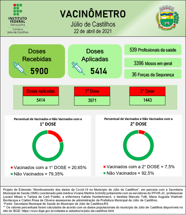 O Instituto Federal Farroupilha Campus Júlio de Castilhos (IFFar-JC), por meio do Projeto de Extensão “Monitoramento dos dados da Covid-19 no município de Júlio de Castilhos", em parceria com a Secretaria Municipal de Saúde (SMS) apresenta os dados sobre a infecção pelo novo coronavírus no município no 12º Relatório Epidemiológico. Este conta com o "Vacinômetro", que destaca o acompanhamento da vacinação contra a Covid-19 em Júlio de Castilhos.