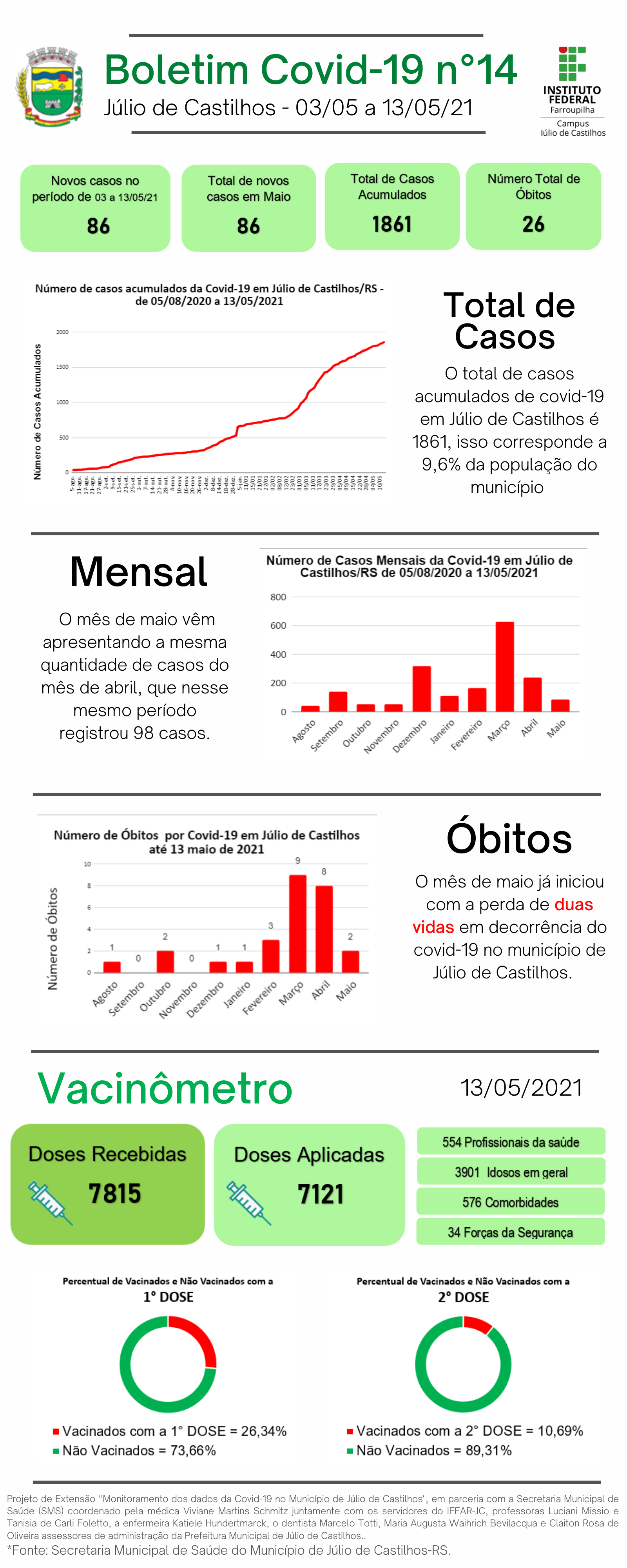 O Instituto Federal Farroupilha Campus Júlio de Castilhos (IFFar-JC), por meio do Projeto de Extensão “Monitoramento dos dados da Covid-19 no município de Júlio de Castilhos", em parceria com a Secretaria Municipal de Saúde (SMS) apresenta os dados sobre a infecção pelo novo coronavírus no município no 14º Relatório Epidemiológico. Este conta com o "Vacinômetro", que destaca o acompanhamento da vacinação contra a Covid-19 em Júlio de Castilhos.