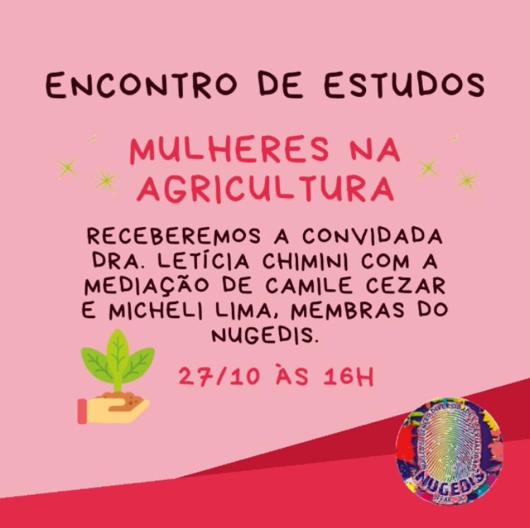 Nessa quarta-feira (27), a partir das 16h, o Núcleo de Gênero e Diversidade Sexual do Campus Júlio de Castilhos (NUGEDIS JC) estará promovendo um encontro do grupo de estudos que receberá a convidada Letícia Chimini, Assistente Social, Mestra em Desenvolvimento Regional - UNISC e Doutora em Serviço Social - PUCRS, para uma fala sobre Mulheres na Agricultura.