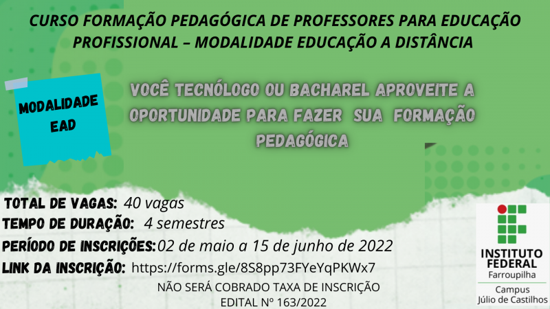 Página inicial > Júlio de Castilhos > Curso Formação Pedagógica de Professores para Educação Profissional, na modalidade de Educação a Distância (EaD)