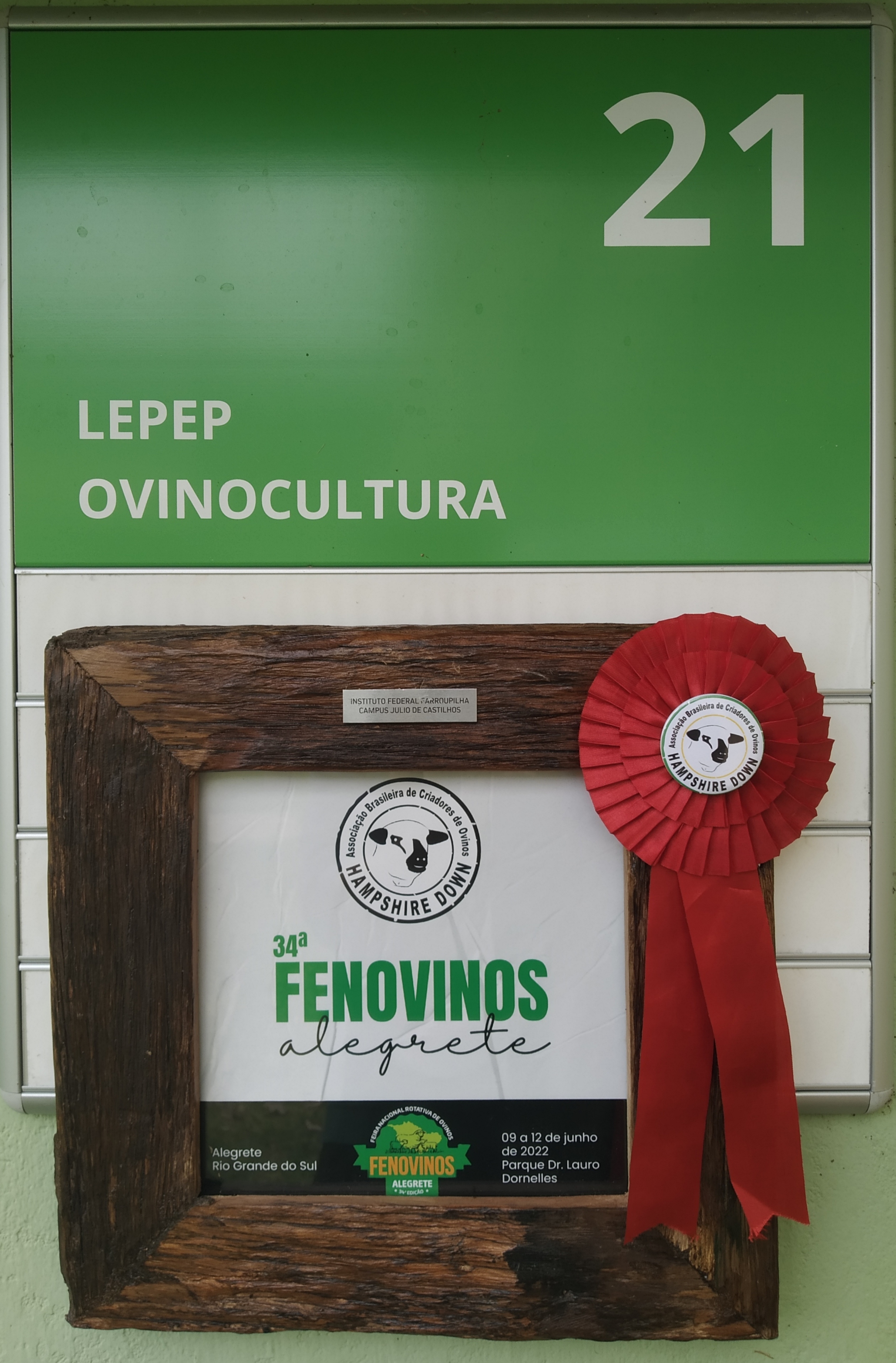 O IFFarroupilha - Campus Júlio de Castilhos participou da XXXIV FENOVINOS, no período de 08 a 12 de junho de 2022, com um com Borrego I.F.F.J.C. Tatuagem 218, animal dentes de leite com 11 meses de idade e 96 kg de peso vivo, sendo um ovino exemplar PO da Raça Hampshire Down e que conquistou o título de segundo Prêmio da Categoria Borrego Menor (categoria 11 a 12 meses de idade). Os animais participaram sob a responsabilidade do professor Rui Pilar e do aluno Felipe Brás do primeiro ano do Curso Técnico em Agropecuária Integrado ao Ensino Médio. Também participaram, acompanhados pelo Técnico em Agropecuária Rodrigo da Rosa Becker, os alunos do terceiro ano Curso Técnico em Agropecuária Integrado Alexandre Messerschmidt, Gustavo Souto Corrêa, Lavinia Simon Ferigolo e Matheus Cocco.