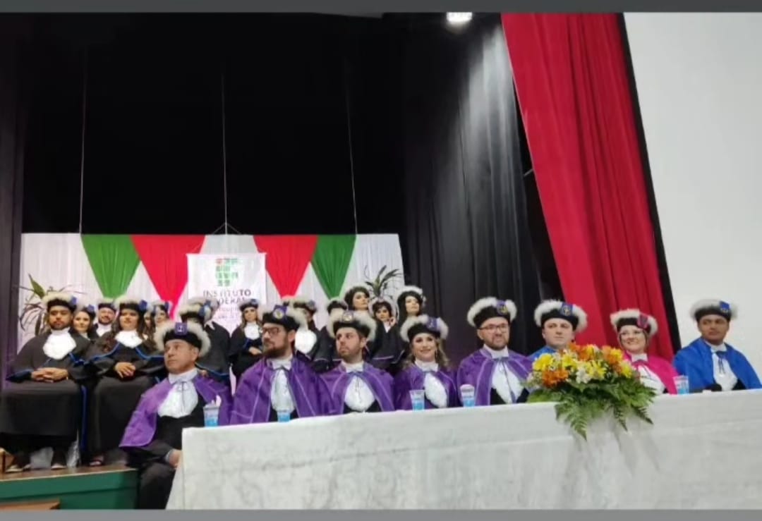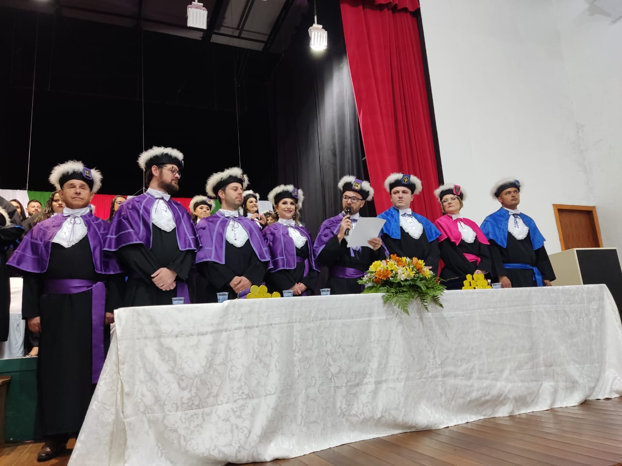 Já na quinta-feira (20/04) foi a vez da colação de grau solene, que aconteceu no Centro Cultural Álvaro Pinto. A solenidade dos cursos de Administração e Ciências Biológicas contou com a presença do pró-reitor de Desenvolvimento Institucional do Instituto Federal Farroupilha - Carlos Rodrigo Lehn, diretor geral do Campus Júlio de Castilhos - Rodrigo Carvalho Carlotto, diretora de ensino do Campus Júlio de Castilhos - Sílvia Regina Montagner, coordenadora e paraninfa da Administração - Luci Ines Schumacher, patrono da Administração - Carlos Alberto Júnior, coordenador e homenageado das Ciências Biológicas - Anderson Saldanha Bueno, paraninfo das Ciências Biológicas - Rodrigo Koning, patrono das Ciências Biológicas - Aristeu Castilhos da Rocha e homenageados/as - Adriana Zamberlan, Diziani Lima, Iochane Garcia Guimarães, Josiana Bassan, Joice Nara Rosa Silva, Landara Maitê Simon e Roberto de Oliveira Weber, familiares, amigos, autoridades e comunidade castilhense.
