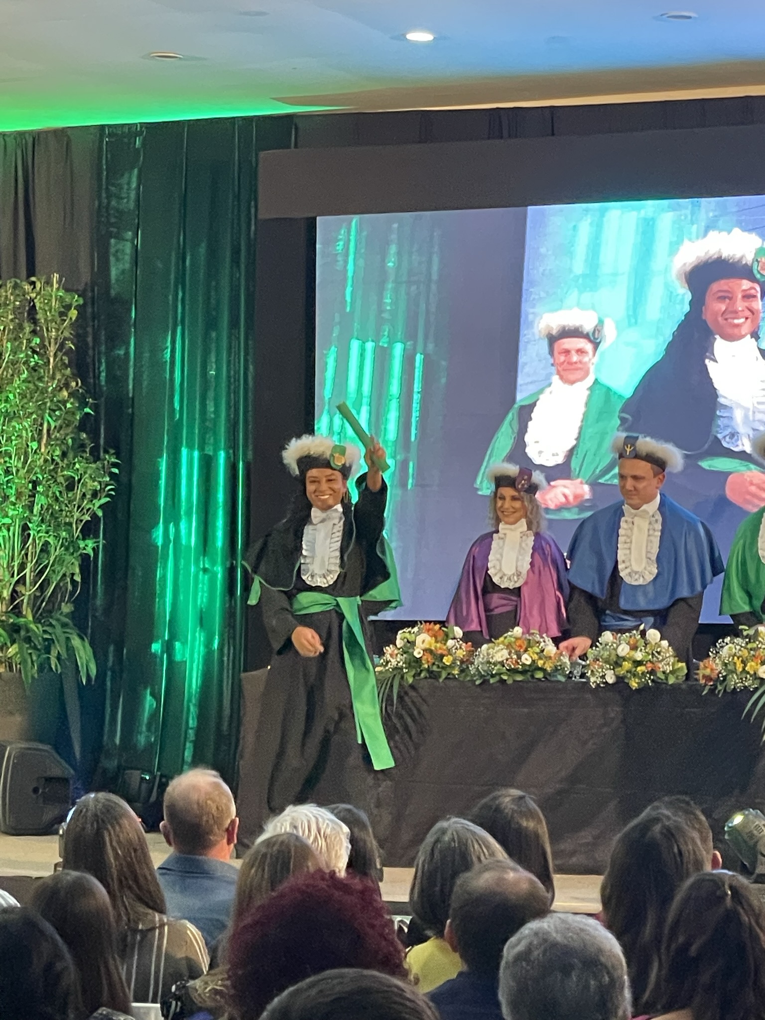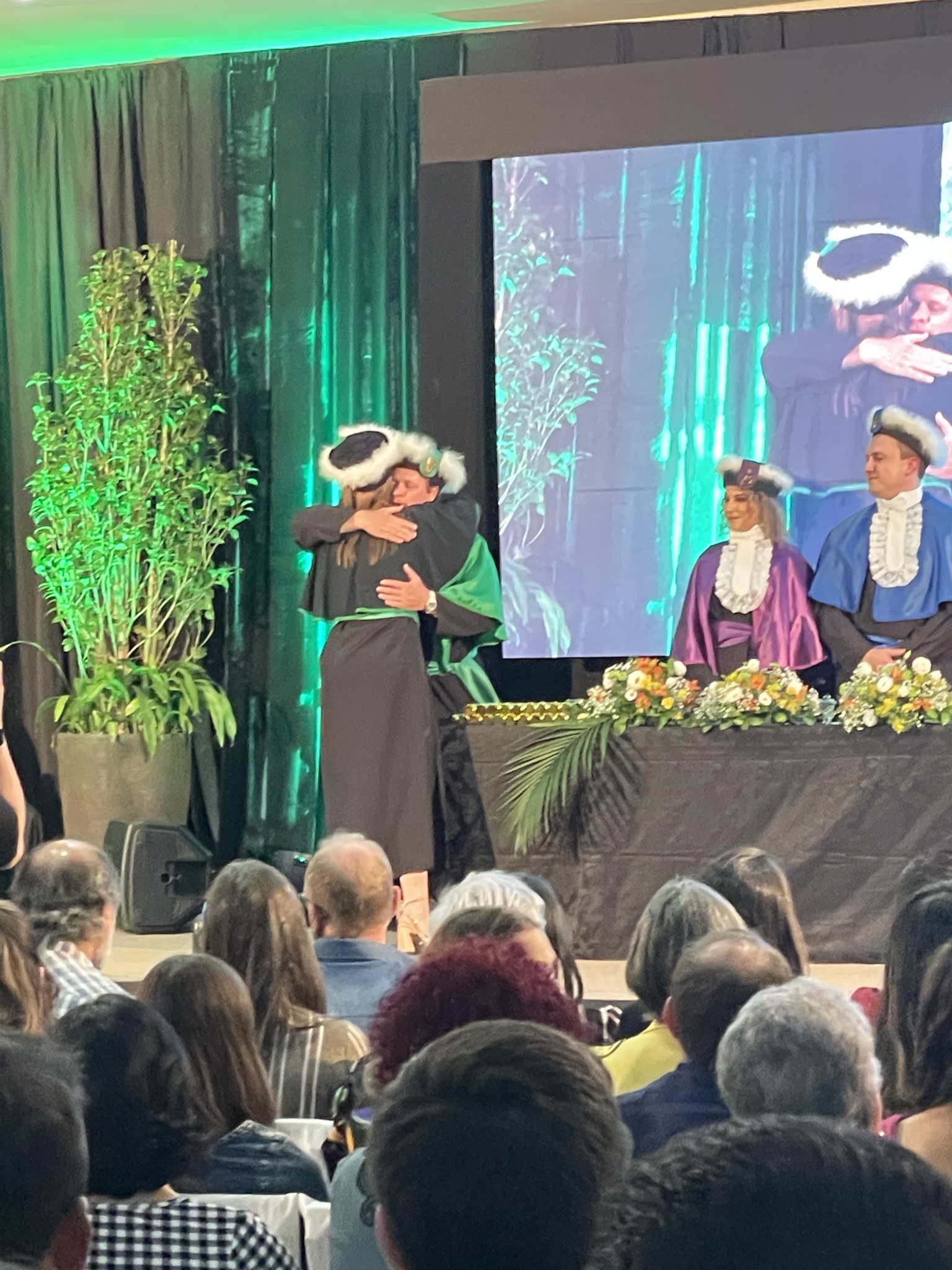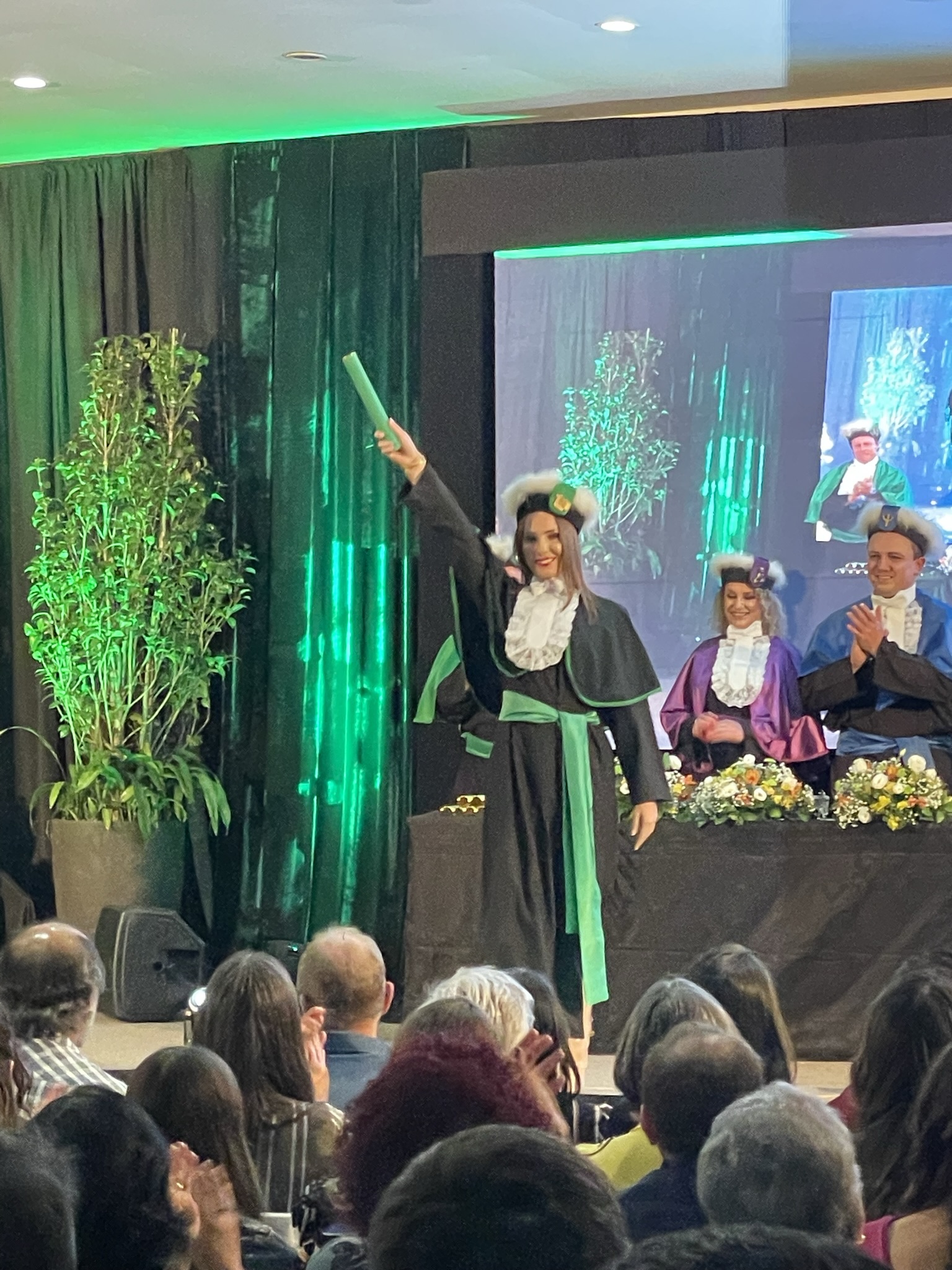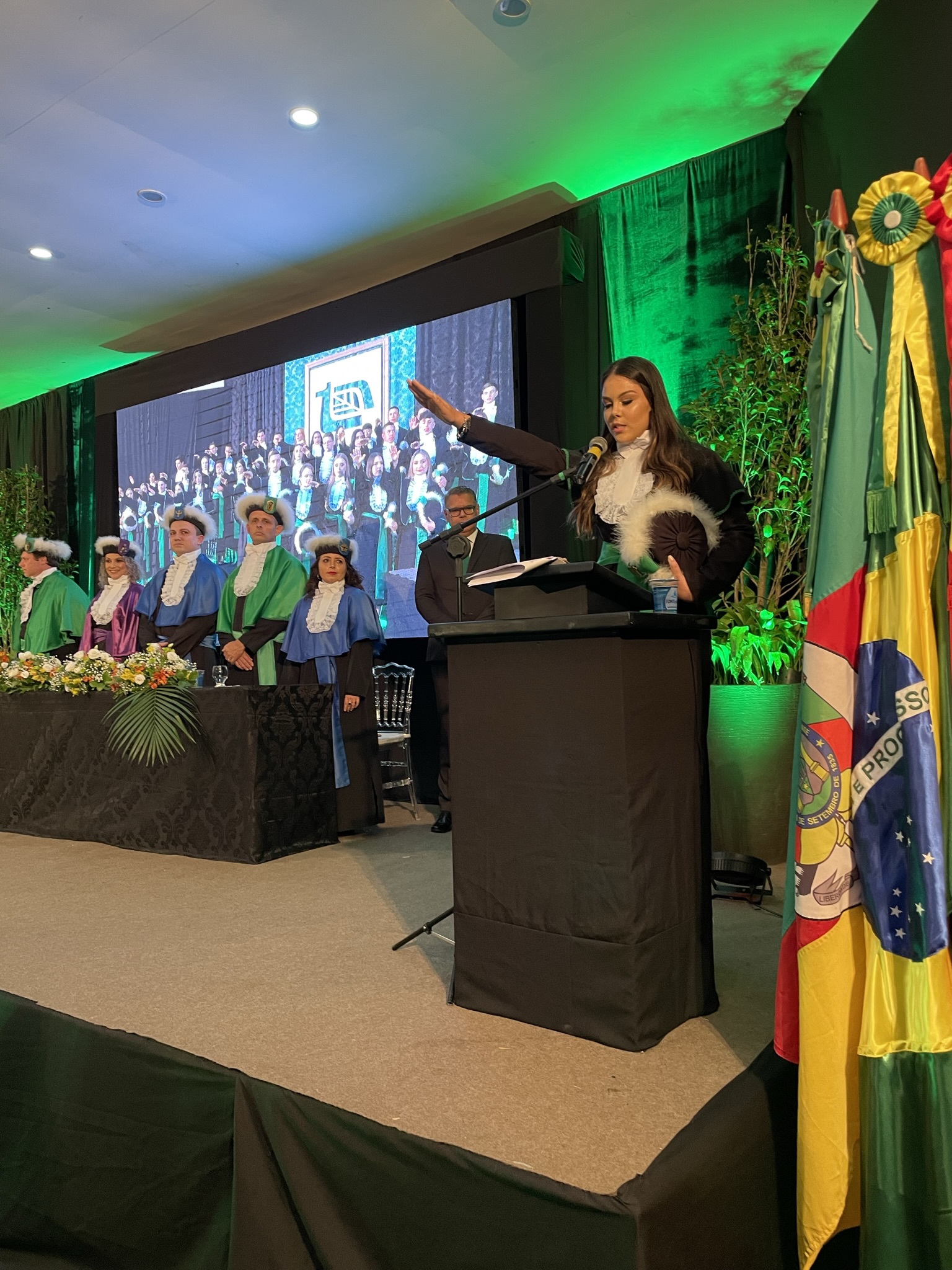 Durante os discursos, a oradora Júlia Bolzan falou da trajetória da turma, de como ficavam ansiosos/as pelas férias e como ficaram aliviados/as em 2020 ao saber que seriam apenas 15 dias em casa. Os 15 dias viraram 2 anos e ansiedade agora era pelo retorno ao campus, ao convívio dos/as colegas e amigos/as. “Nesse momento dizer apenas obrigada é muito pouco, faltam palavras para descrever o quanto a turma é grata pelo apoio dos/as professores/as e da instituição”, destacou Júlia.