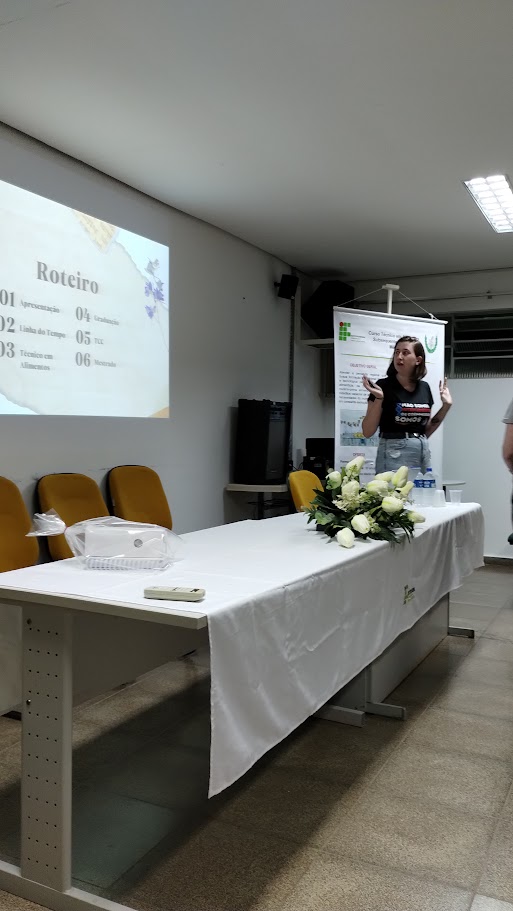 Na sequência foi a vez de Iasmin contar sobre sua trajetória no campus, que começou no curso técnico em alimentos, no qual ela já entrou participando de projetos de pesquisa e extensão, que faziam ela passar bastante tempo no campus. Após o técnico cursou Tecnologia de Alimentos na UFSM, pois realmente “se encontrou na área”. A técnica começará o mestrado na próxima semana.