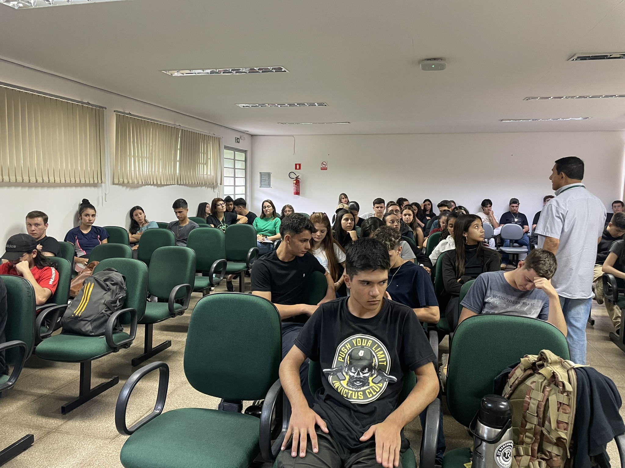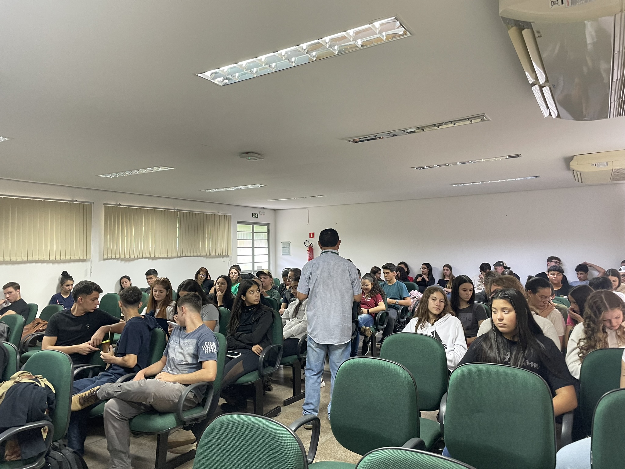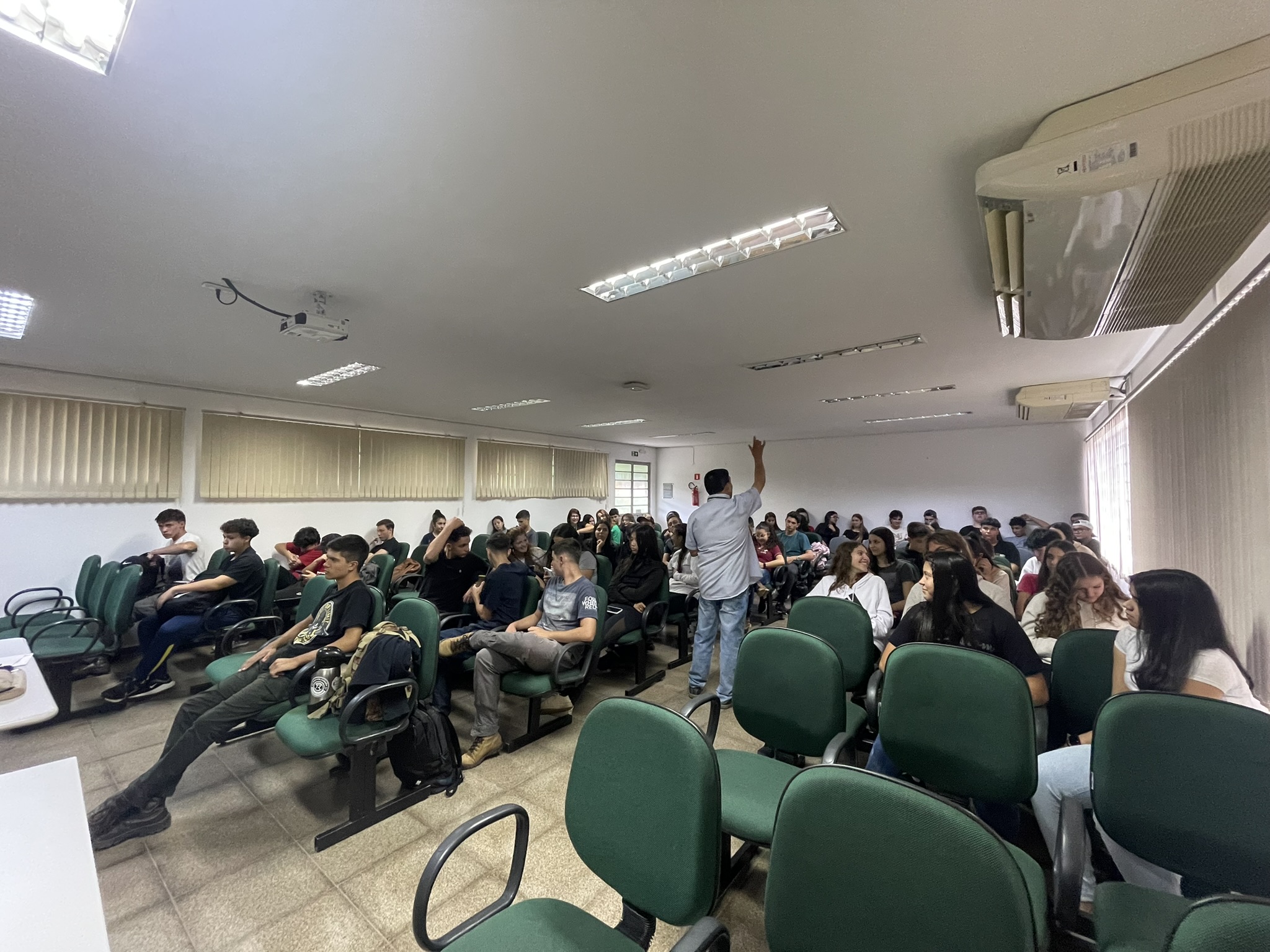 Na tarde de terça-feira (23), no anfiteatro do prédio A, os/as alunos/as dos primeiros anos da agropecuária que antes da exibição do documentário tiveram uma breve apresentação do professor Aristeu, que contou um pouco de história aliada a arte brasileira, trazendo personagens, que são referência nos povos originários e são importantes na história do Brasil, como Clara Nunes e Ailton Krenak (mais recente).