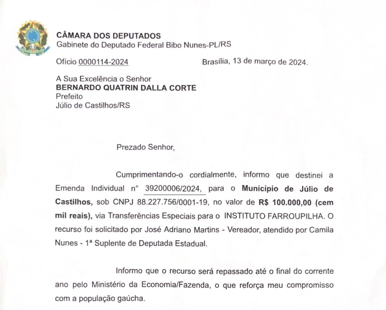 A emenda parlamentar do deputado federal Bibo Nunes (R$100 mil reais) veio através da solicitação do vereador José Adriano Pixulim. Estiveram presentes no gabinete do Prefeito, Bernardo Dallacorte, para recebimento/entrega da emenda, o deputado estadual Rafael Braga, a procuradora jurídica do município, Bruna Mario da Rosa, o diretor geral do Campus Júlio de Castilhos, Rodrigo Carvalho Carlotto, o coordenador de infraestrutura do Campus Júlio de Castilhos Cassio Sasse dos Santos e o Assessor do Deputado Federal Bibo Nunes, Flávio dos Santos.