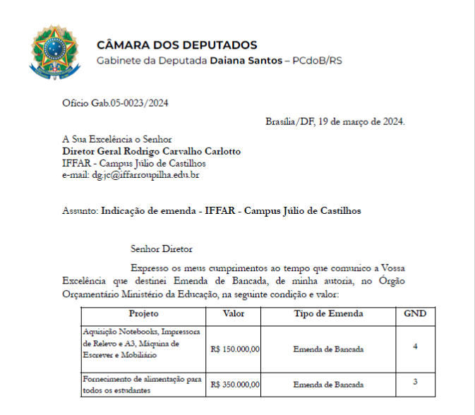 No mês de março, a direção geral do Campus Júlio de Castilhos recebeu uma comunicação da deputada federal Daiana Santos referente à destinação de uma emenda de bancada de sua autoria com o valor de 500 mil reais. Conforme o documento, o valor destina-se a: 150 mil reais para Aquisição Notebooks, Impressora de Relevo e A3 e Mobiliário e 350 mil para Fornecimento de alimentação para todos os estudantes. A deputada já havia anunciado a verba em outubro de 2023, quando esteve visitando o campus.