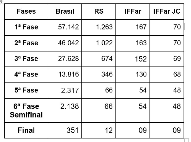 Na manhã de sábado, foi divulgado o resultado das equipes classificadas para a final presencial da 17ª Olimpíada Nacional em História do Brasil, e o campus Júlio de Castilhos estará representado por 9 equipes (27 alunos)! O Rio Grande do Sul classificou, ao todo, 12 equipes para a final. O professor Ênio Grigio destaca que temos no campus a melhor equipe de escola pública da Região Sul e a melhor equipe do Estado. A 17ª ONHB iniciou com 57.147 equipes e somente 351 são finalistas.