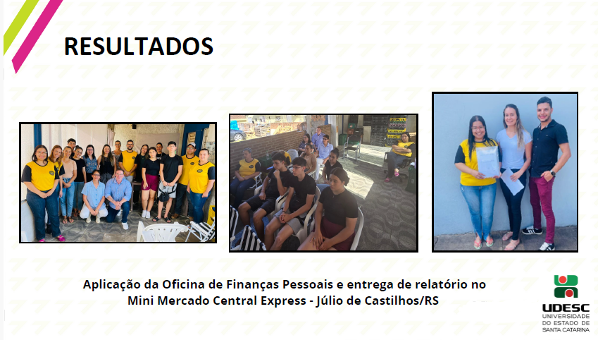 Foram realizadas oficinas de Finanças Pessoais que tiveram 61 participantes, e Marketing Pessoal, com 50 participantes. A docente percebe que houve um retorno positivo dos envolvidos que gostaram muito das oficinas. Além disso, os estudantes tiveram uma experiência prática completa envolvendo pesquisa, análise de dados, atuação direta com a comunidade e devolutiva às empresas, promovendo crescimento pessoal, acadêmico e social.