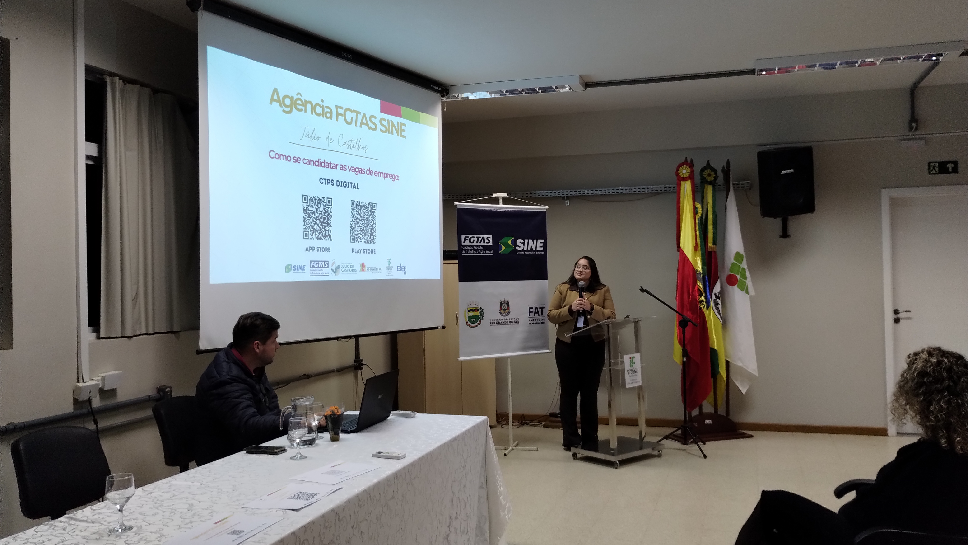 Natalia Dias e Ricardo Monteiro, da agência FGTAS/Sine de Júlio de Castilhos fizeram uma palestra no campus na segunda-feira, 18 de agosto, dividida em dois momentos: pela manhã para as turmas do integrado e à noite para estudantes da gradução, subsequente e EJA/EPT.