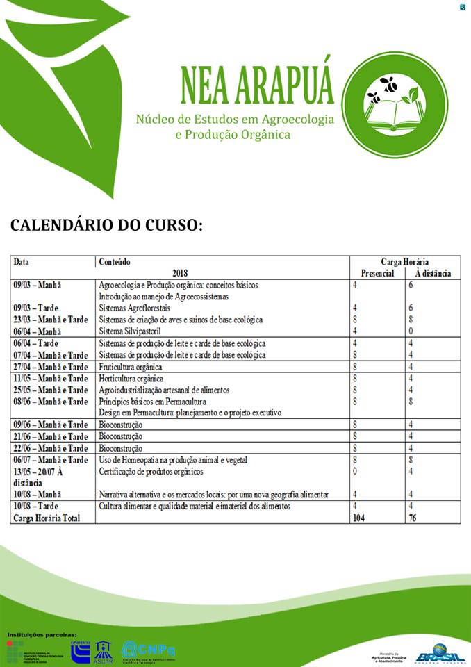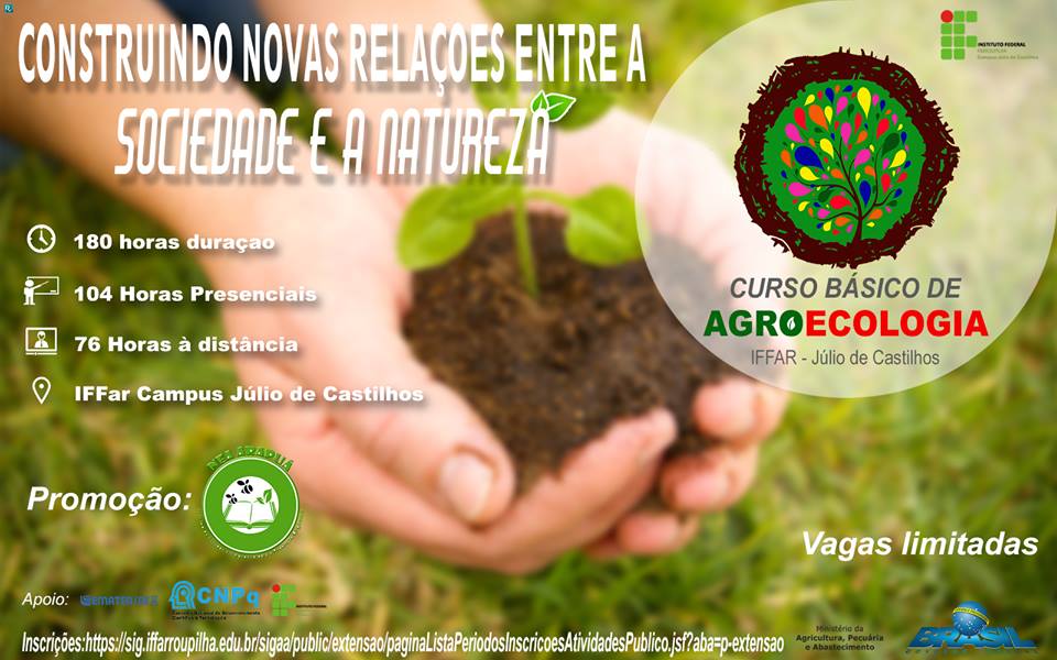 O Núcleo de Estudos em Agroecologia e Produção Orgânica NEA ARAPUÁ, do IFFar Campus Júlio de Castilhos discute a construção de novas relações entre a sociedade e a natureza, no Curso de Extensão de Agroecologia. O curso tem duração de 180 horas divididas em 104 horas presenciais e 74 horas à distância.