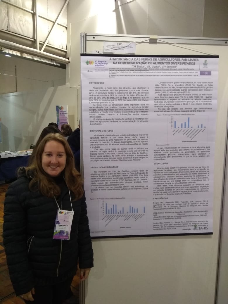 O Iffar - Campus Júlio de castilhos esteve representado no 6° Simpósio de Segurança Alimentar – Desvendando Mitos, na FAURGS em Gramado, de 15 a 18 de maio. O evento é promovido pela Sociedade Brasileira de Ciência e Tecnologia de Alimentos (SBCTA). Na oportunidade, ocorreram debates acerca de mitos envolvendo hábitos alimentares, nutrição, segurança e inocuidade de alimentos, processamento de alimentos e produção sustentável, com renomados palestrantes nacionais e internacionais.
