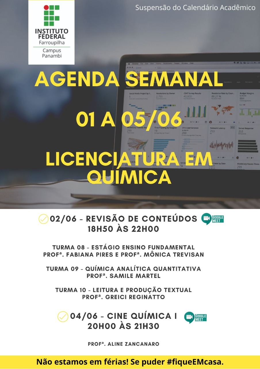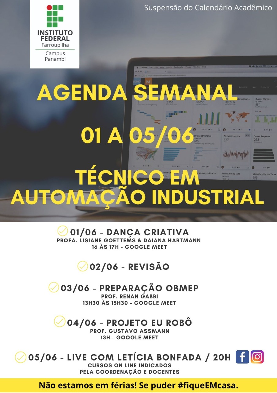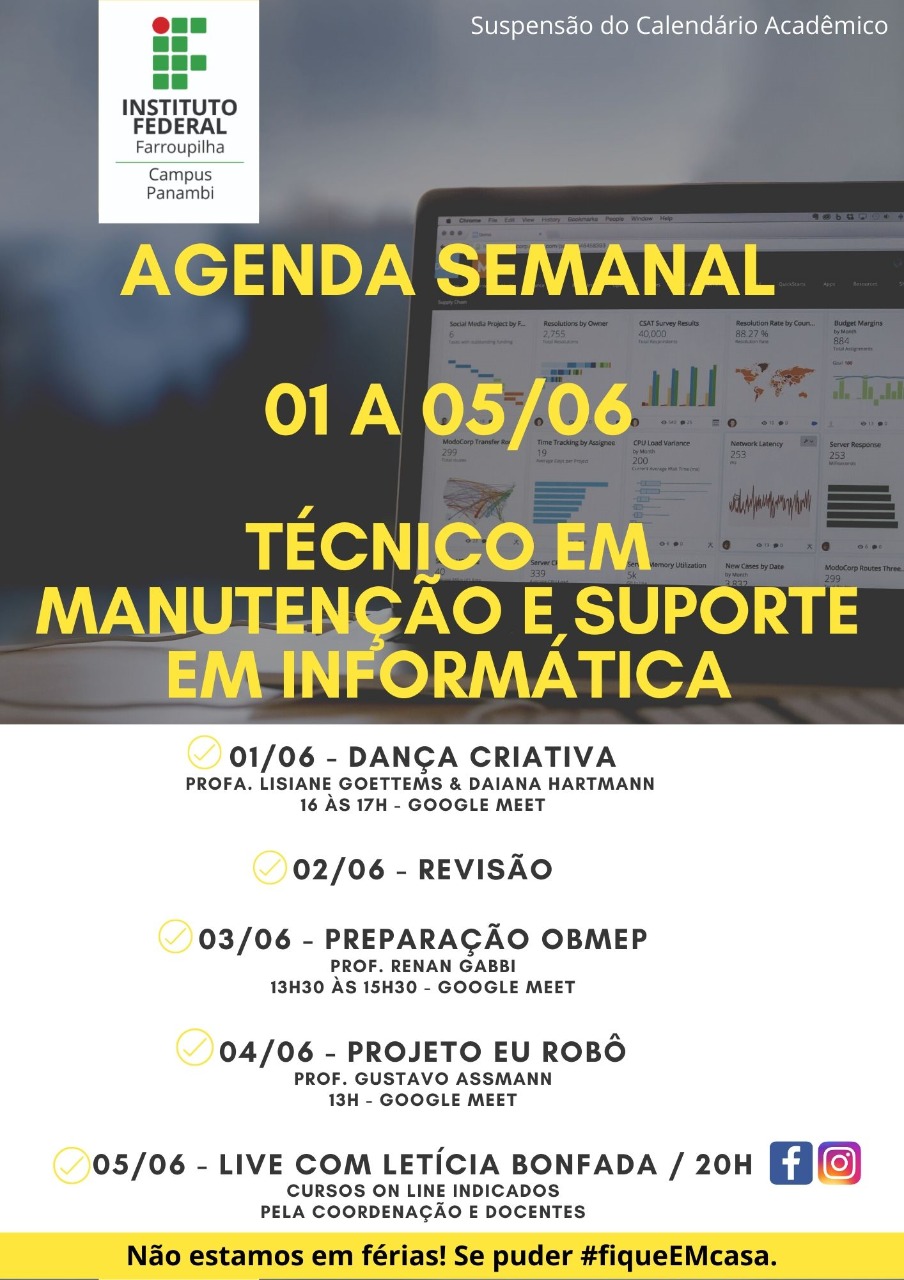 A cada semana, uma agenda contendo as ações que serão desenvolvidas por cada curso, será divulgada no portal institucional e nas redes sociais do Campus Panambi.