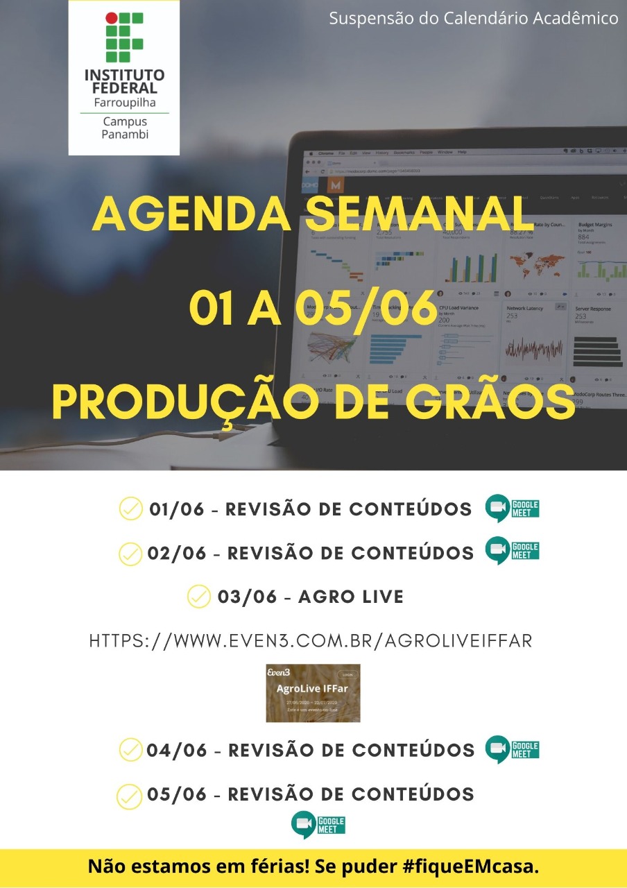 No período compreendido entre 18/05 a 30/06, serão desenvolvidas atividades de recuperação da aprendizagem, transmissões de palestras, organização de eventos integrando os estudantes dos diferentes campi do Instituto Federal Farroupilha, entre outras. As atividades administrativas continuarão a ser realizadas em formato remoto, como já vinha acontecendo desde o dia 17 de março.