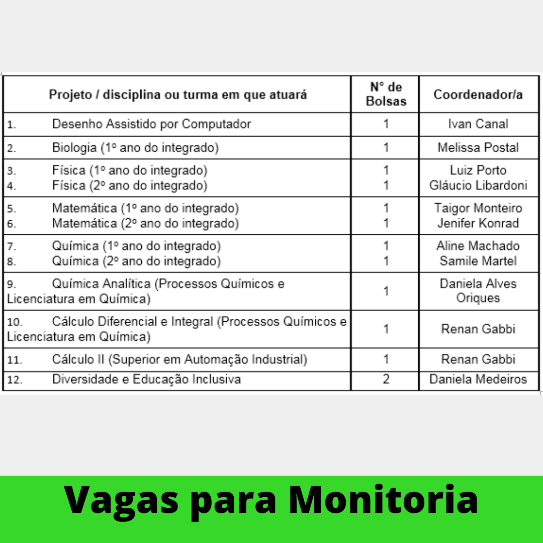 Docentes de algumas disciplinas ofertam vagas em Projetos de Monitoria para alunos de cursos técnicos e superiores. Os Projetos de Monitoria são destinados ao reforço escolar em disciplinas teóricas e em disciplinas que exijam atividades práticas de laboratório.