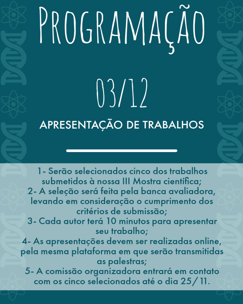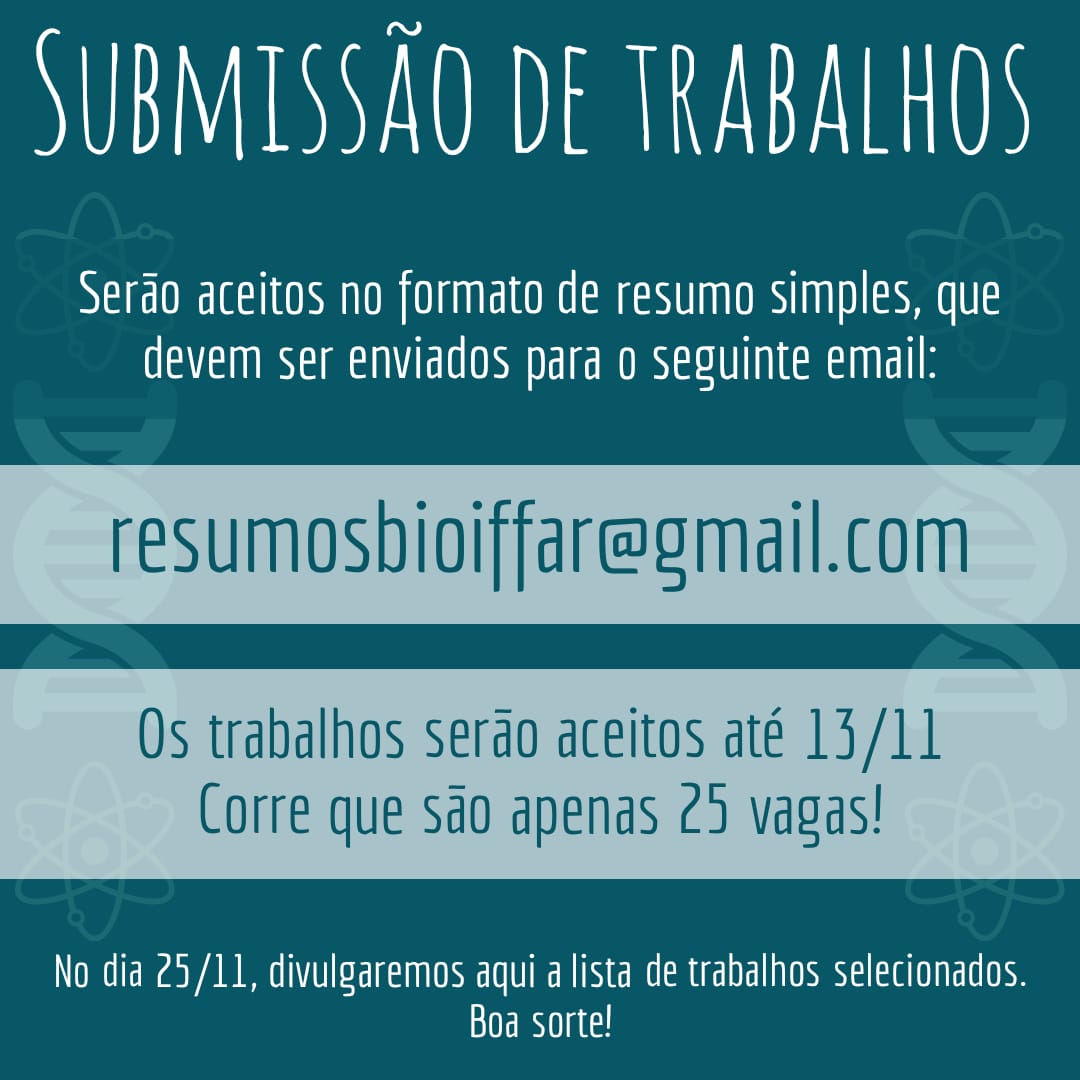 As inscrições podem ser realizadas até dia 7/11, pelo link https://linktr.ee/jornadaacademicabioiffar. O evento é aberto à participação de estudantes e comunidade externa.