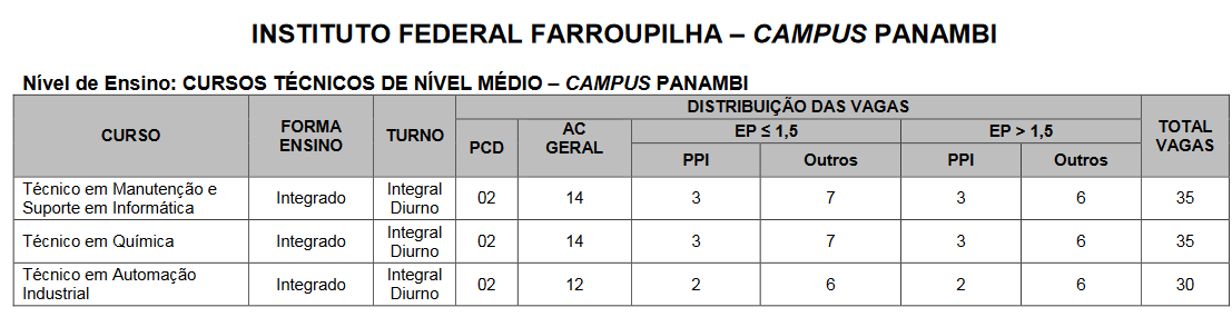Estão abertas as inscrições para os cursos técnicos integrados ao Ensino Médio no Instituto Federal Farroupilha – Campus Panambi. São ofertadas 30 vagas para Automação Industrial, 35 vagas para Química e 35 vagas para Manutenção e Suporte em Informática, totalizando 100 vagas em cursos totalmente gratuitos. Poderão se inscrever alunos que finalizaram o Ensino Fundamental ou estudos equivalentes.