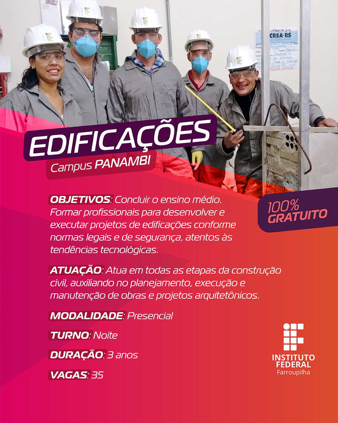 As inscrições para o Curso Técnico em Edificações, na modalidade de Educação de Jovens e Adultos, vão até terça-feira, 23 de março. São 35 vagas para quem tem 18 anos ou mais e deseja fazer o Ensino Médio junto com o Curso Técnico em Edificações.