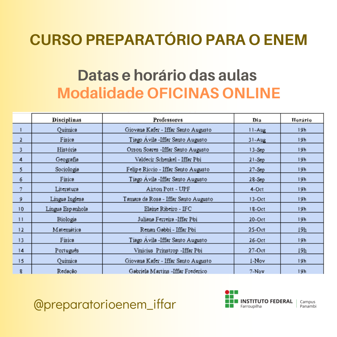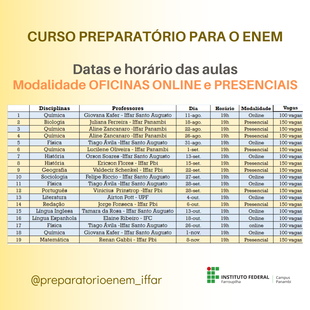 Dúvidas podem ser esclarecidas pelos contatos Este endereço de email está sendo protegido de spambots. Você precisa do JavaScript ativado para vê-lo. (e-mail) e @preparatorioparaoenem_iffar (Instagram).