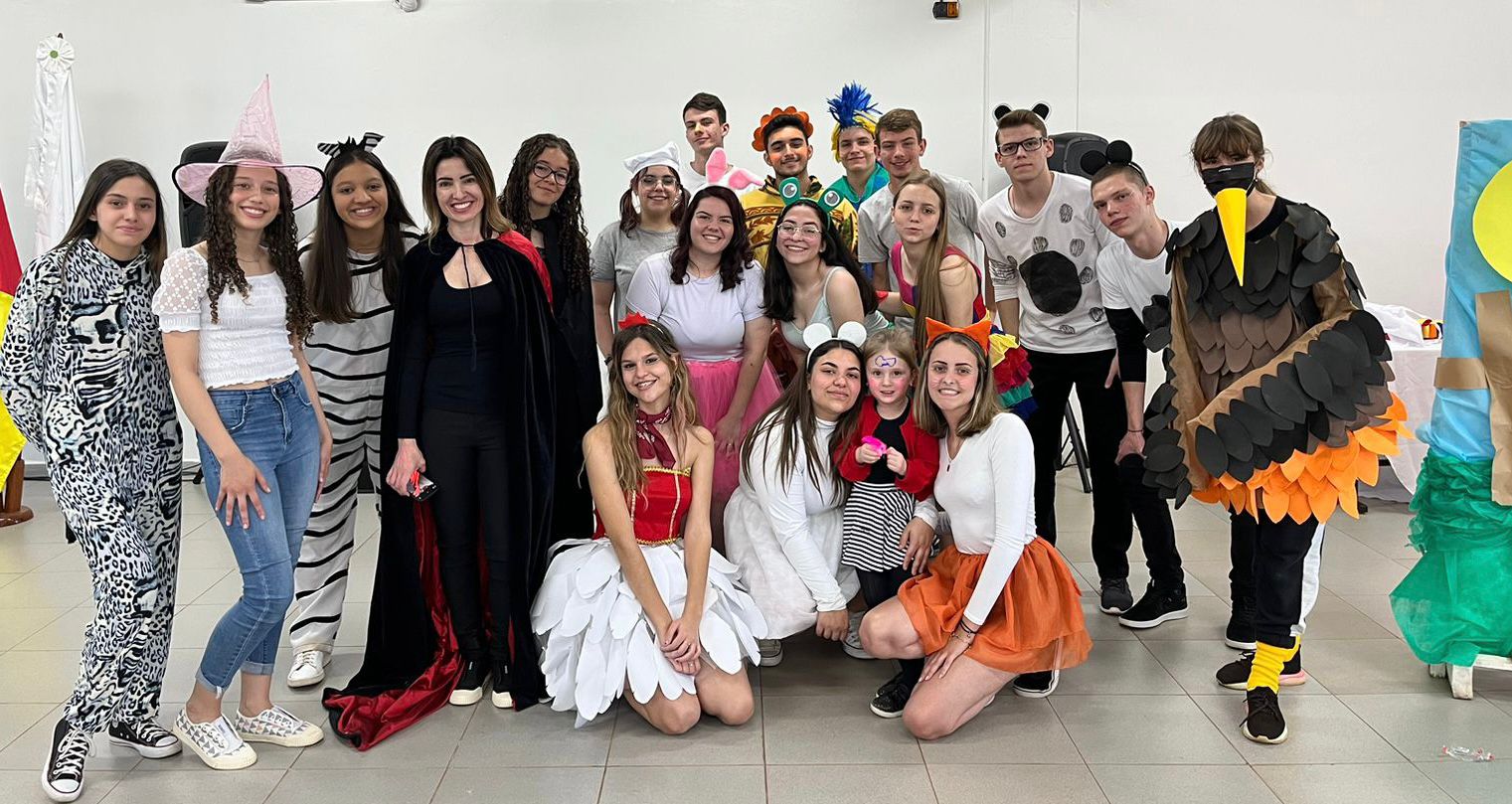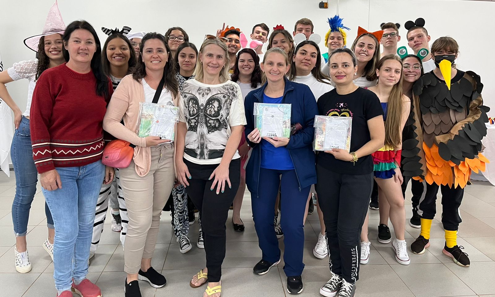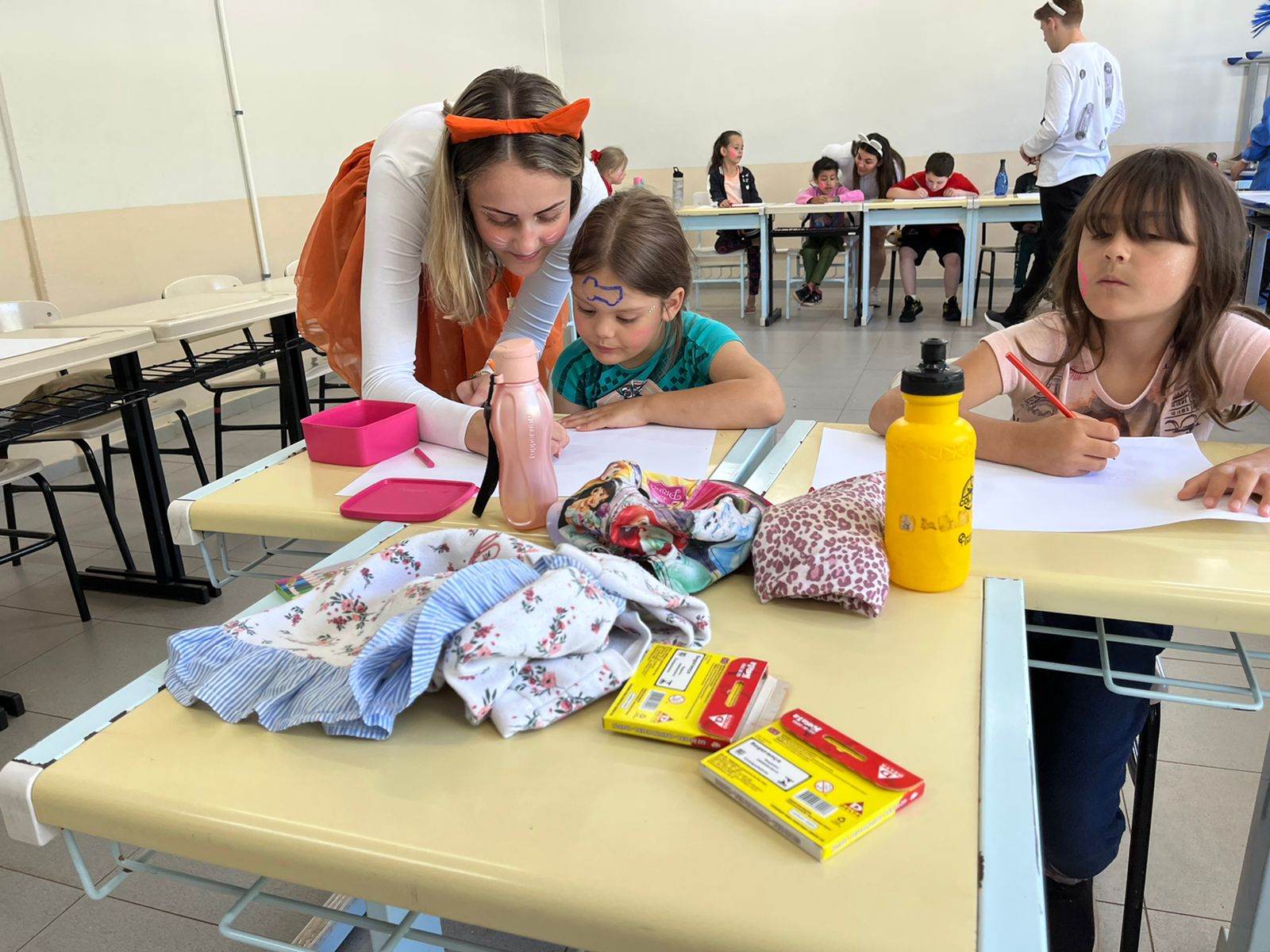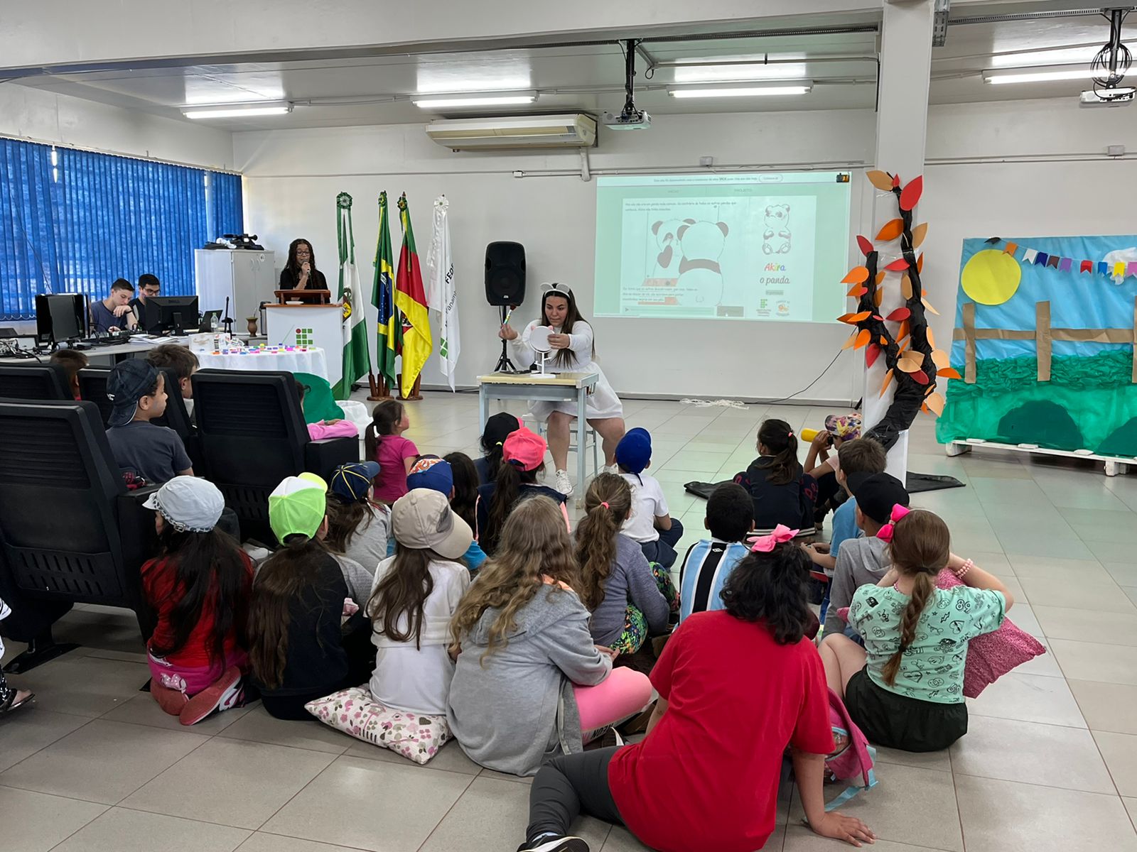 Na manhã de quarta-feira, 09/11, integrantes do projeto “Fábrica de Histórias”, do IFFar – Campus Panambi, receberam estudantes do 1º e 2º ano do Ensino Fundamental da Escola Municipal Dona Leopoldina para apresentação de três obras teatrais. As histórias de “Chica, a galinha caipira”, “O Leão Leonel” e “Akira, o panda” foram encenadas por um grupo de estudantes de cursos do Ensino Médio do IFFar, coordenados pela professora Miquela Piaia, docente de língua inglesa do Campus.