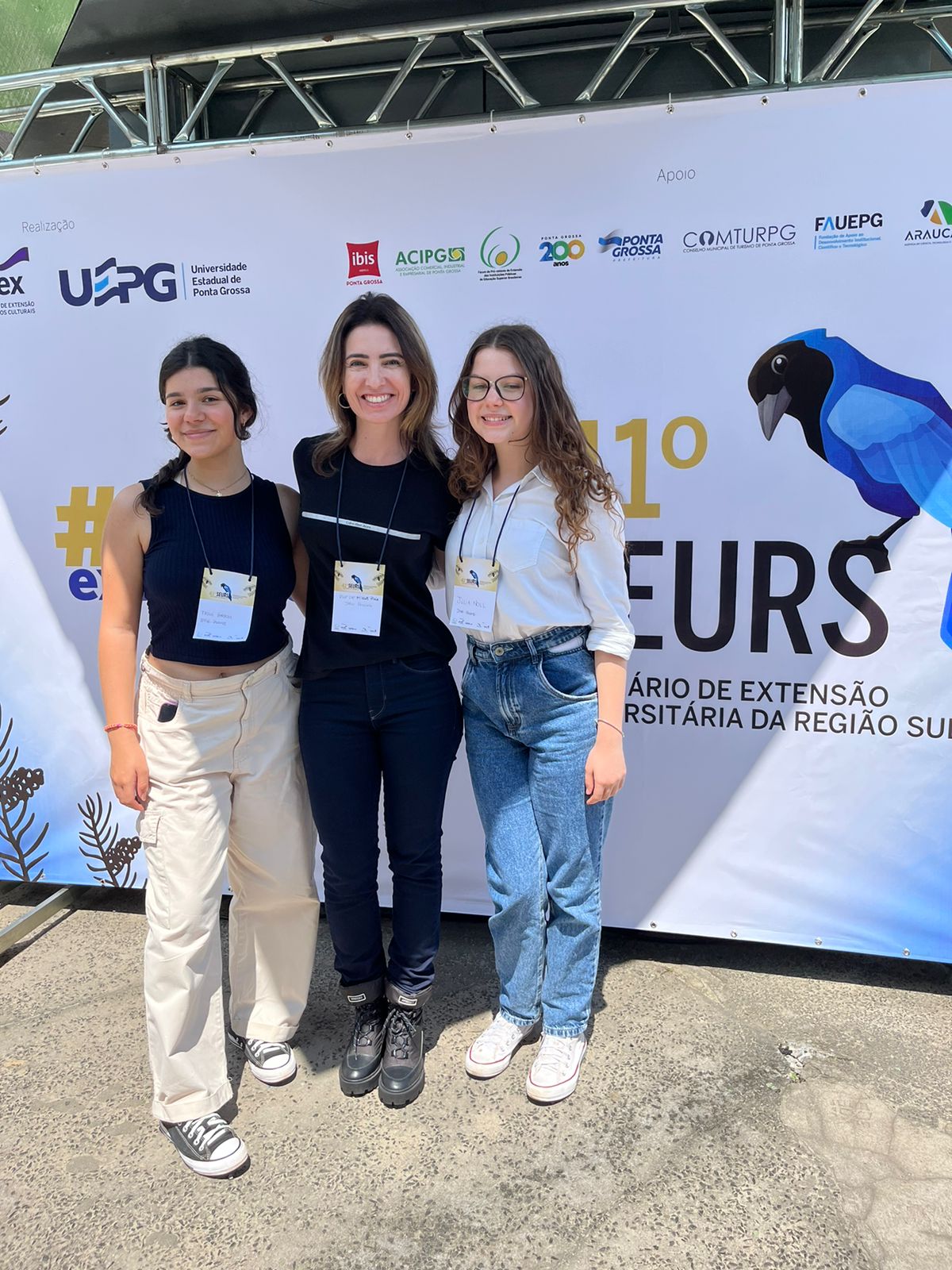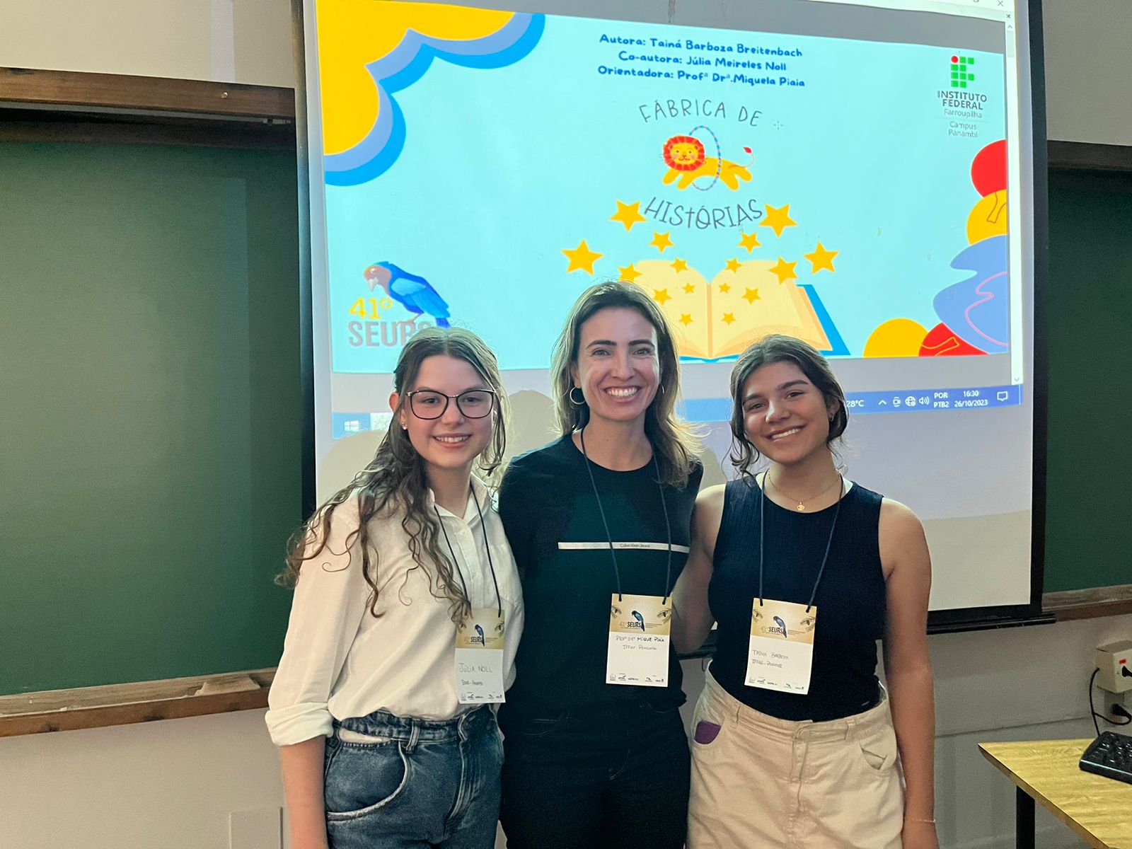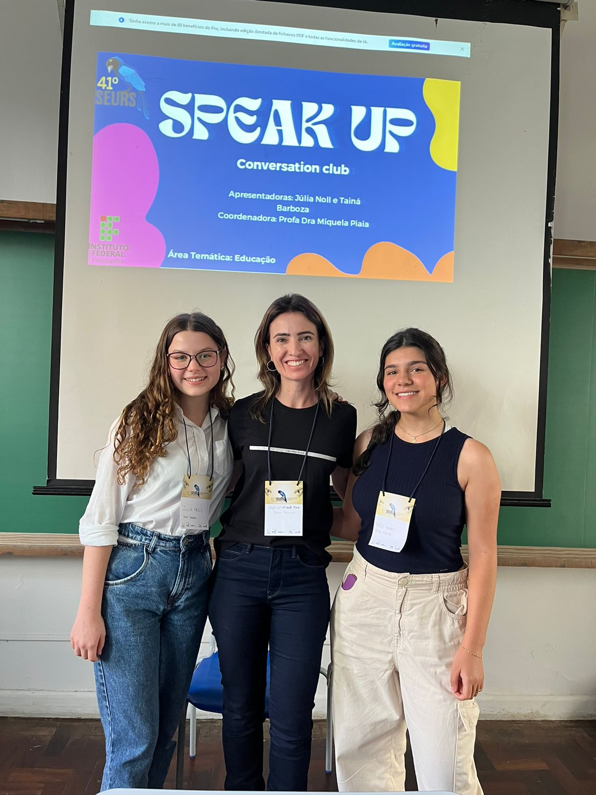 Com apresentação dos projetos de extensão, “Speak Up – Conversation Club” e “Fábrica de Histórias”, as estudantes Tainá Barboza e Júlia Noll, juntamente com a professora orientadora, Miquela Piaia, representaram o Campus Panambi no 41º SEURS.