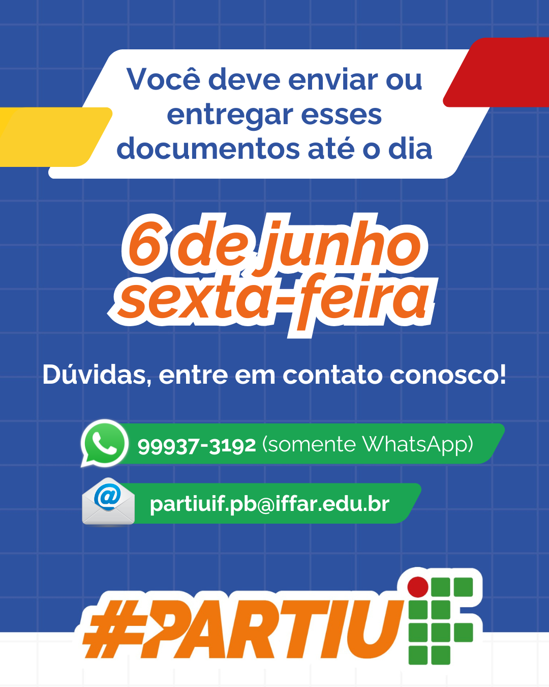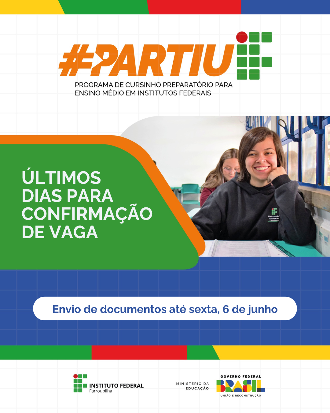 Os candidatos selecionados para participar do cursinho preparatório gratuito Partiu IF devem ficar atentos: o prazo para confirmação de vaga encerra nesta sexta-feira, 6 de junho.