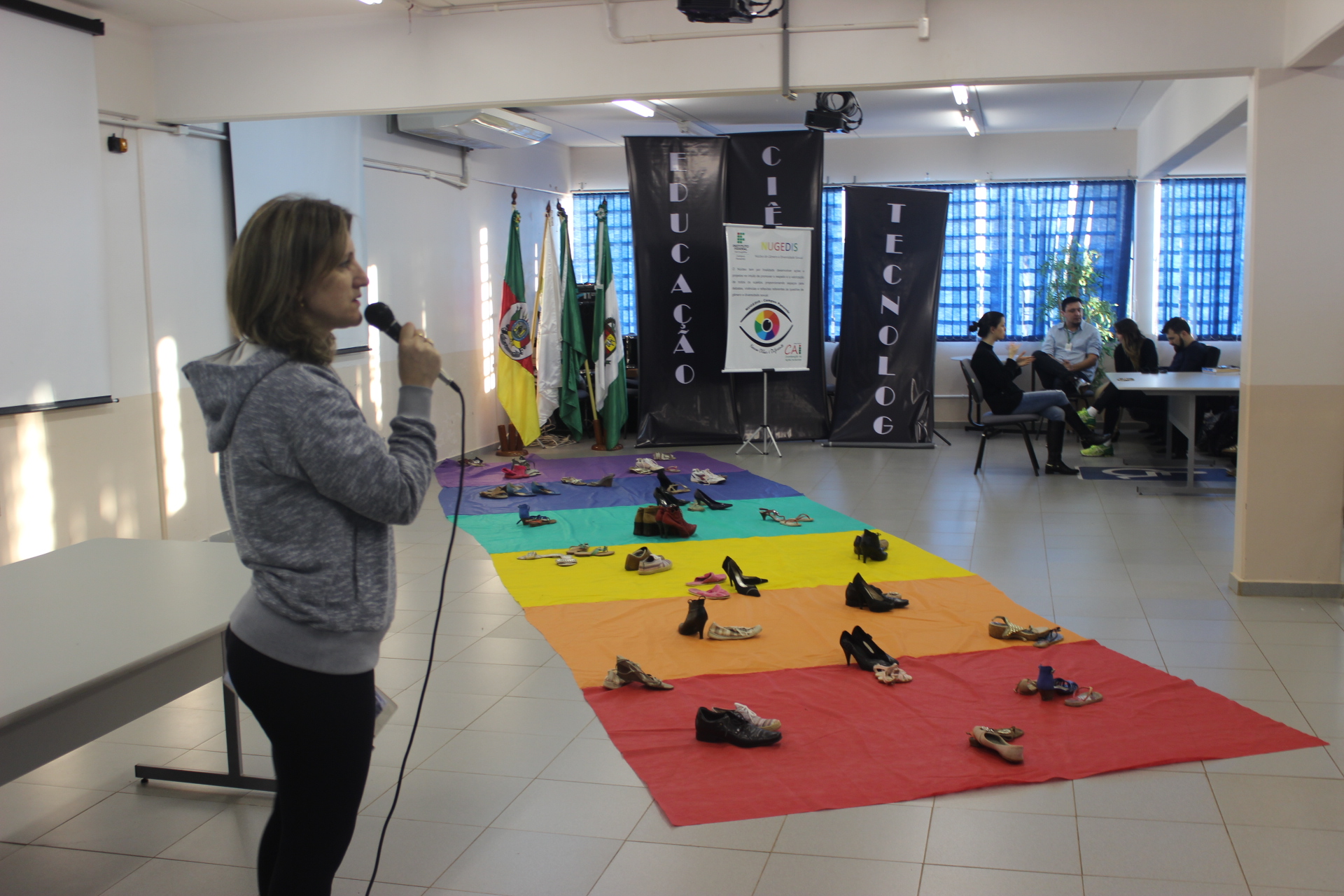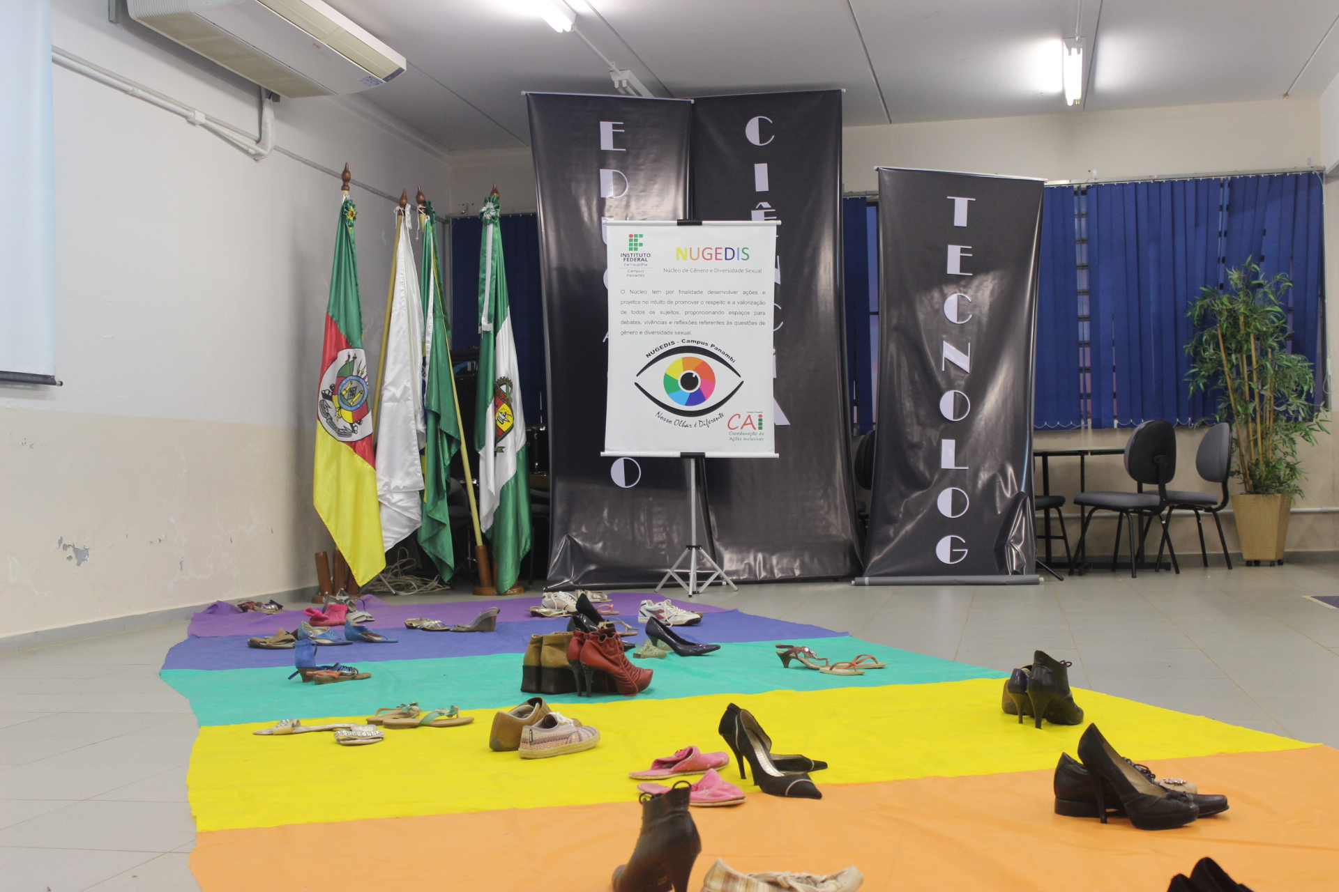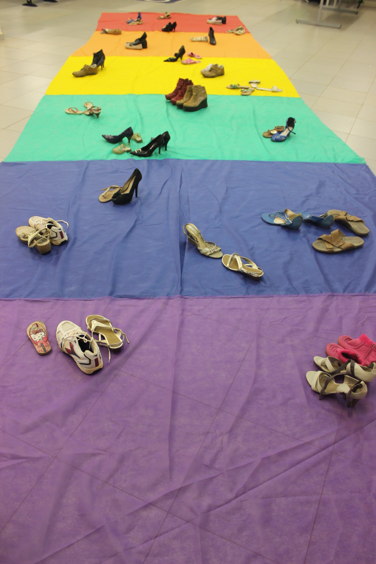 Após a explanação inicial, todos os presentes foram convidados a refletir sobre uma instalação com calçados, organizada sobre a bandeira do arco-íris. Nela estavam dispostos pares de sapatos diferentes, unindo pés masculinos e femininos, somente pés femininos, etc., possibilitando a reflexão sobre os diversos tipos de união entre seres humanos. Após a atividade, a bandeira ficou exposta no hall de entrada do campus e os calçados – arrecadados em campanha prévia – serão destinados a uma instituição do município.