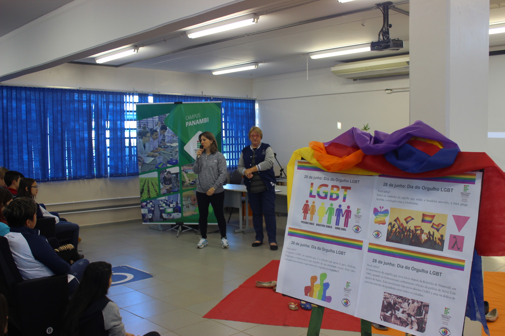 Dia 28 de junho é considerado o Dia do Orgulho LGBTTI (lésbicas, gays, bissexuais, travestis, transexuais e pessoas intersex). A palavra orgulho é utilizada como um antônimo de vergonha, que foi por muito tempo usada para oprimir todos os indivíduos LGBTTI. Na manhã do dia 27/06, alunos e servidores do IFFar – Campus Panambi estiveram reunidos no auditório da instituição e assistiram a uma fala das professoras Lisiane Goettems e Sylvia Messer, representantes do Núcleo de Gênero e Diversidade Sexual (NUGEDIS), sobre o sentido da palavra “orgulho” e porque é necessário uma data para lembrar essa causa. O momento de reflexão teve enfoque na importância do afeto, do reconhecimento e orgulho acerca de nossas experiências pessoais e vivências sociais com e na diferença.