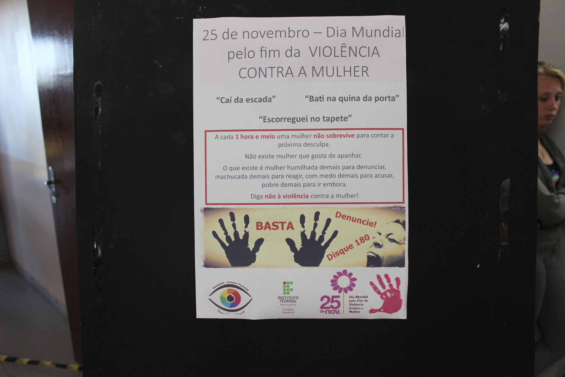 Na manhã do dia 27/11, integrantes do Núcleo de Gênero e Diversidade Sexual (NUGEDIS) do IFFar – Campus Panambi, promoveram uma atividade de sensibilização com os estudantes do ensino médio sobre o Dia da não Violência contra a mulher, comemorado internacionalmente em 25/11. Na atividade realizou-se uma instalação no corredor do campus e, durante o intervalo, vários dados sobre situações de violência contra a mulher foram abordados pelas integrantes do NUGEDIS.