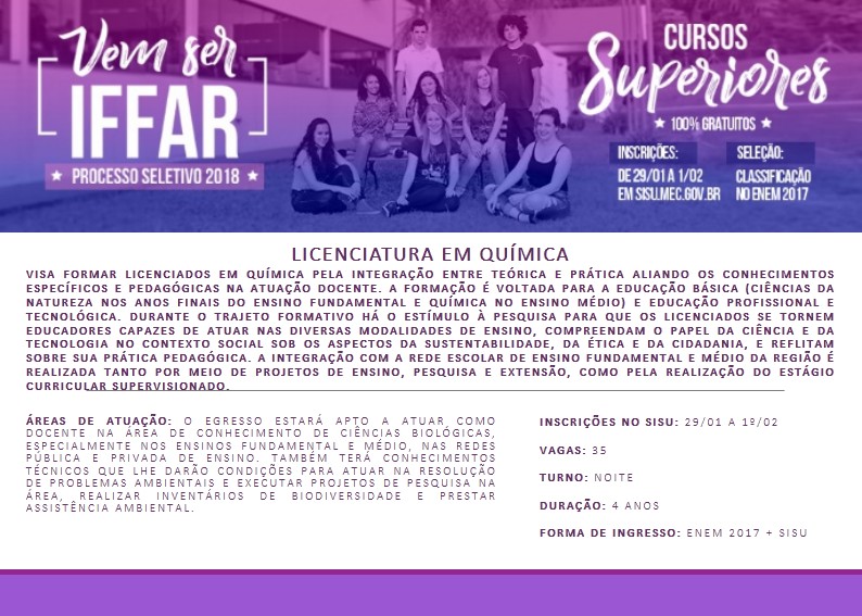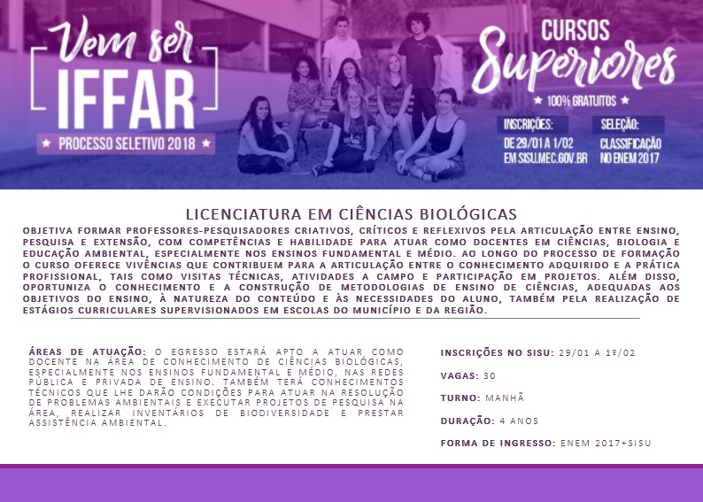 A seleção será via SISU (sisu.mec.gov.br) e para participar o candidato deverá ter realizado o ENEM 2017.