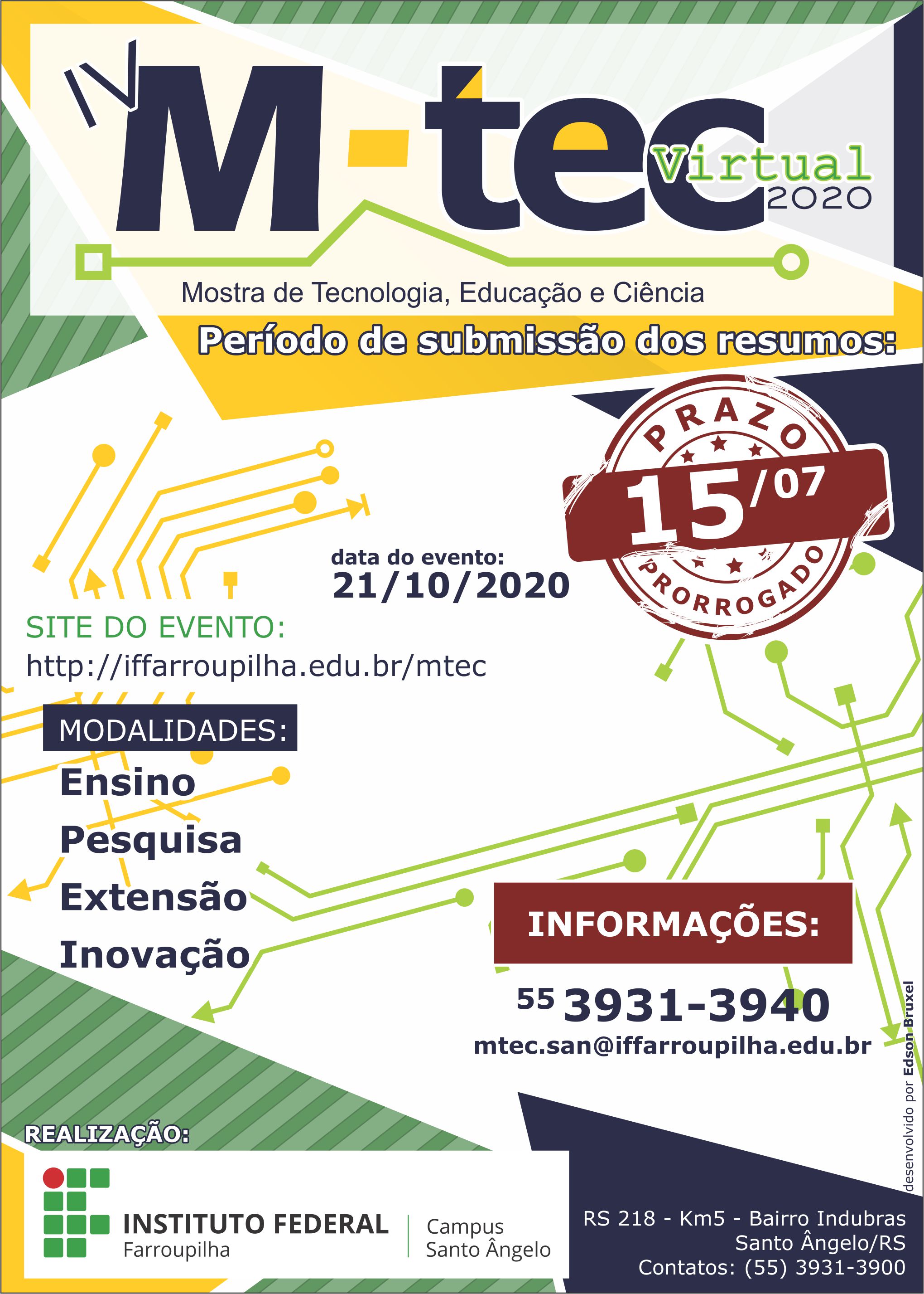A Comissão Organizadora da IV M-TEC do IFFar Campus Santo Ângelo comunica que foi prorrogado o período de submissão de resumos até o dia 15 de julho de 2020.