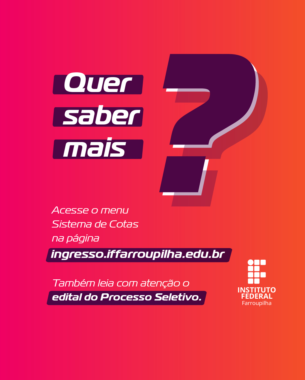 Lembramos que é responsabilidade da/o candidata/o refletir a respeito do seu direito (ou não) a concorrer pela reserva de vagas. Nos processos seletivos de estudantes do IFFar, trabalhamos com a presunção de veracidade das autodeclarações.